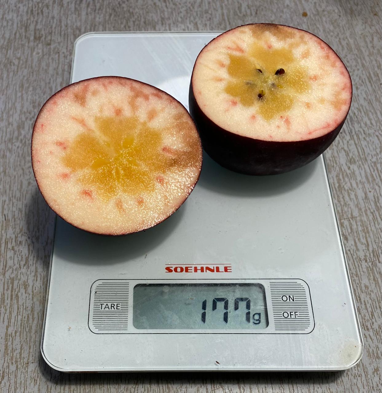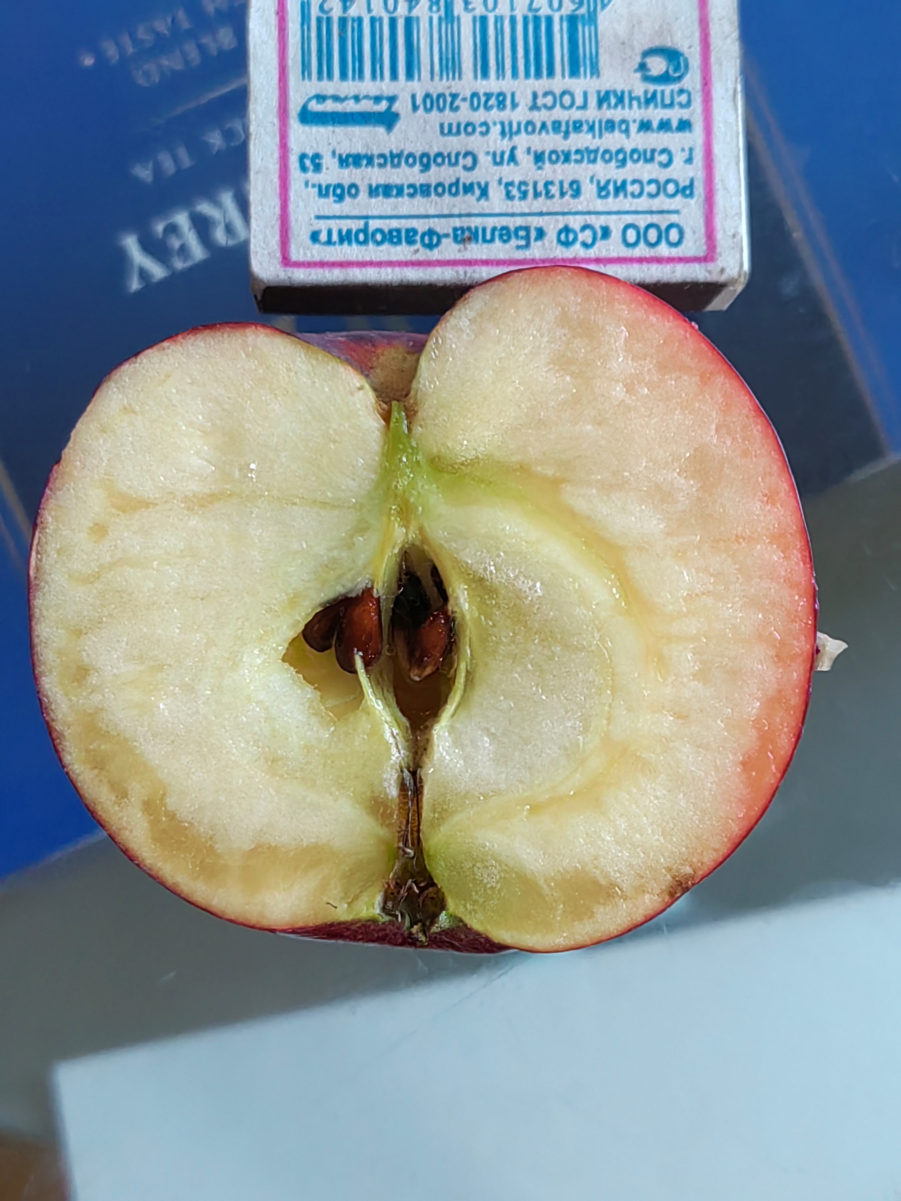 Очень сочное, хрустящее, вкус очень хороший, сахар -16,0°Brix, кислоты еще многовато. Протестирую теперь 7-8 сентября. На сегодня крахмала около 60%, семечки-коричневые.