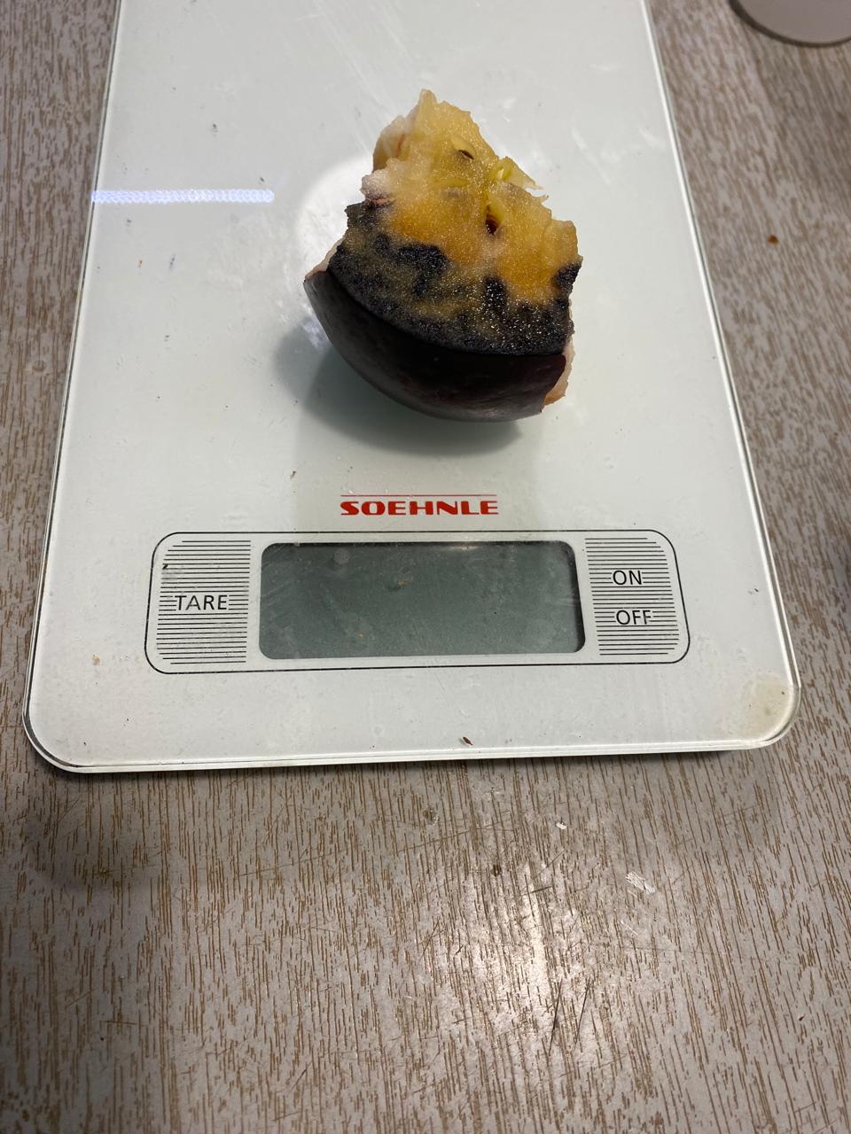 По цвету мякоти видно, что ещё не созрели. У созревшего- желтая, на вашем фото- зеленоватая. Уровень сахара 13,5 это подтверждает. У созревшего ВП в МУ Сахар -17,9’Brix. ВП у меня не осыпается, подожду 3 недели до созревания.