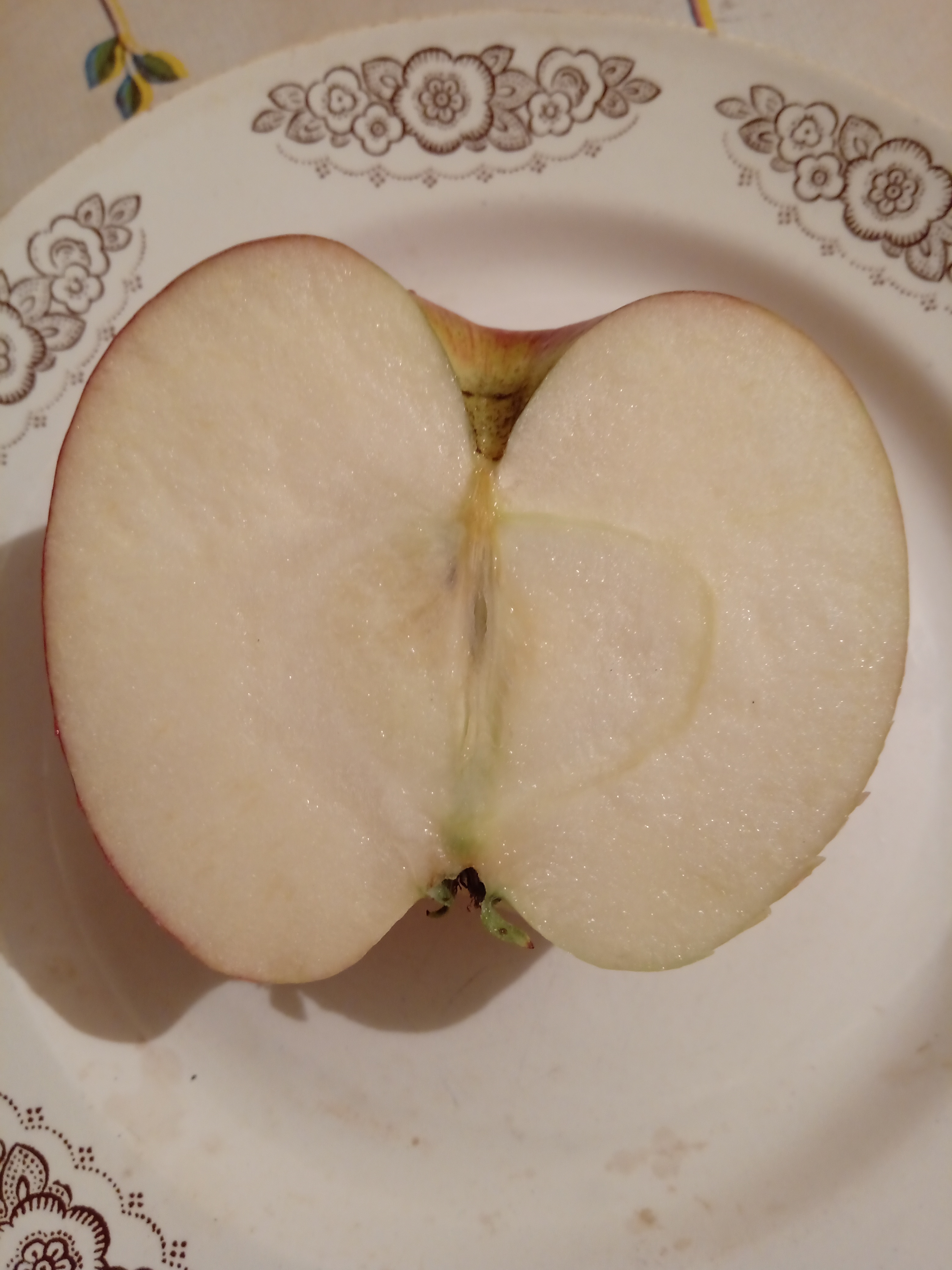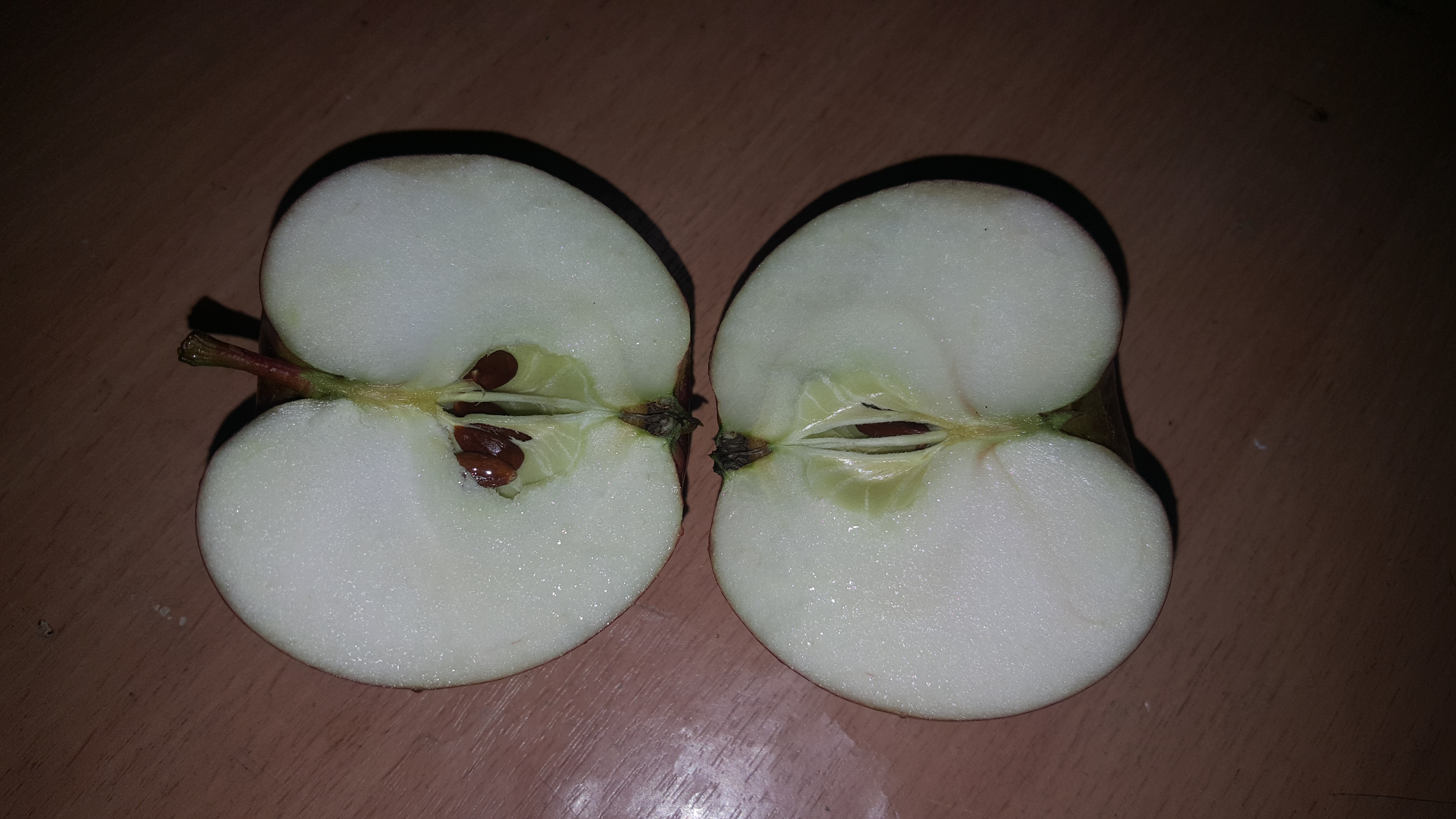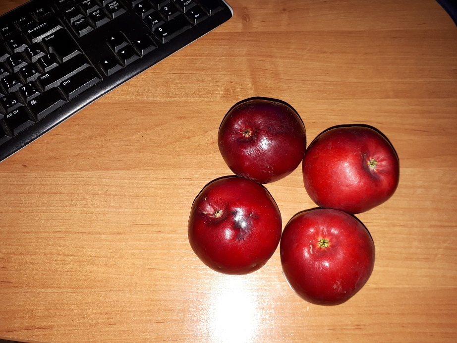 Угостили яблочком неизвестного сорта. Вкус описать сложно, но я попробую: сочный, но не сильно, то есть сок не брызгает, чувствуется, что яблоко видимо зимнее и ещё не дозрело, больше сладкое чем кислое, твёрдое. Может Беркутовское?