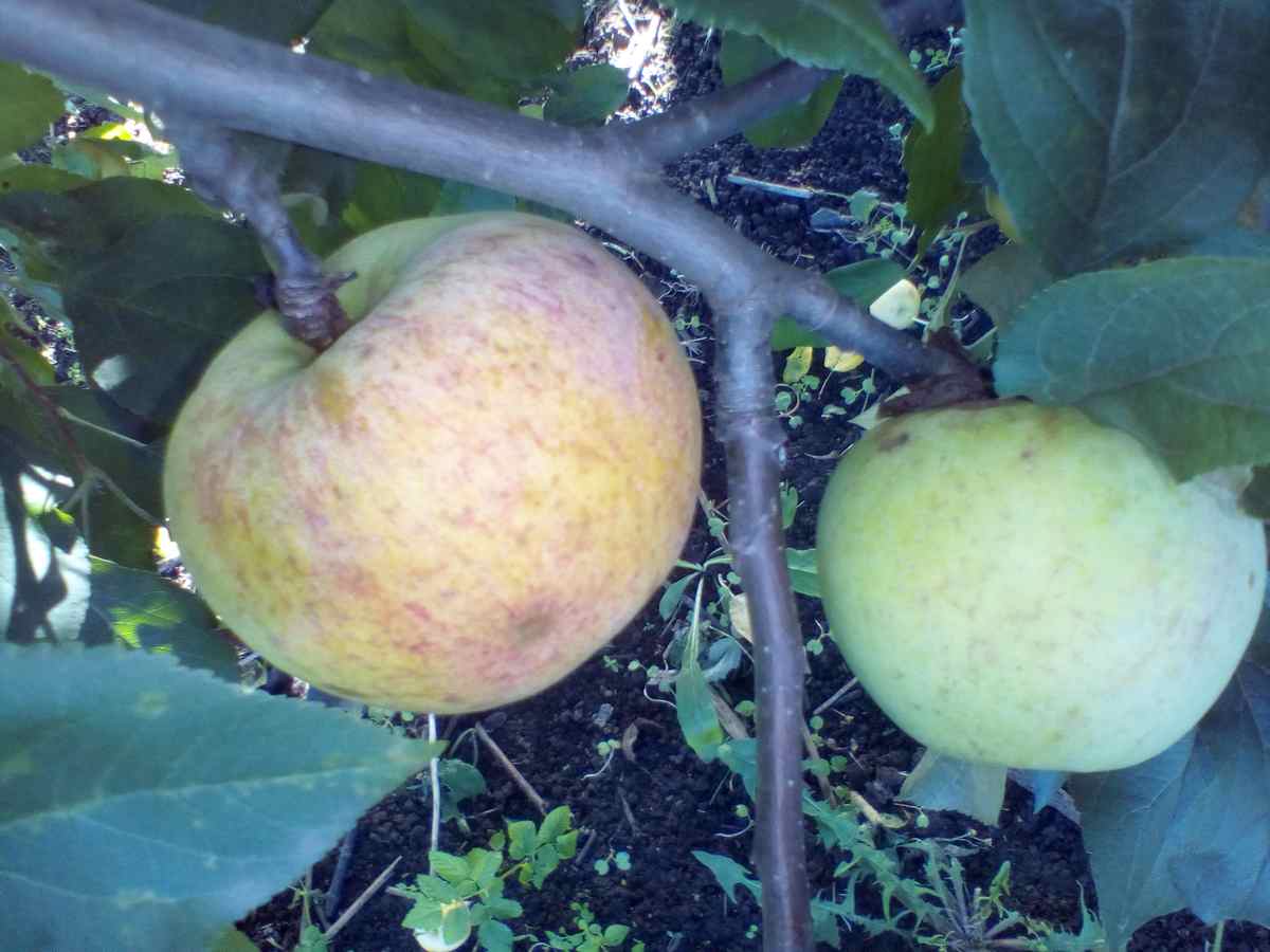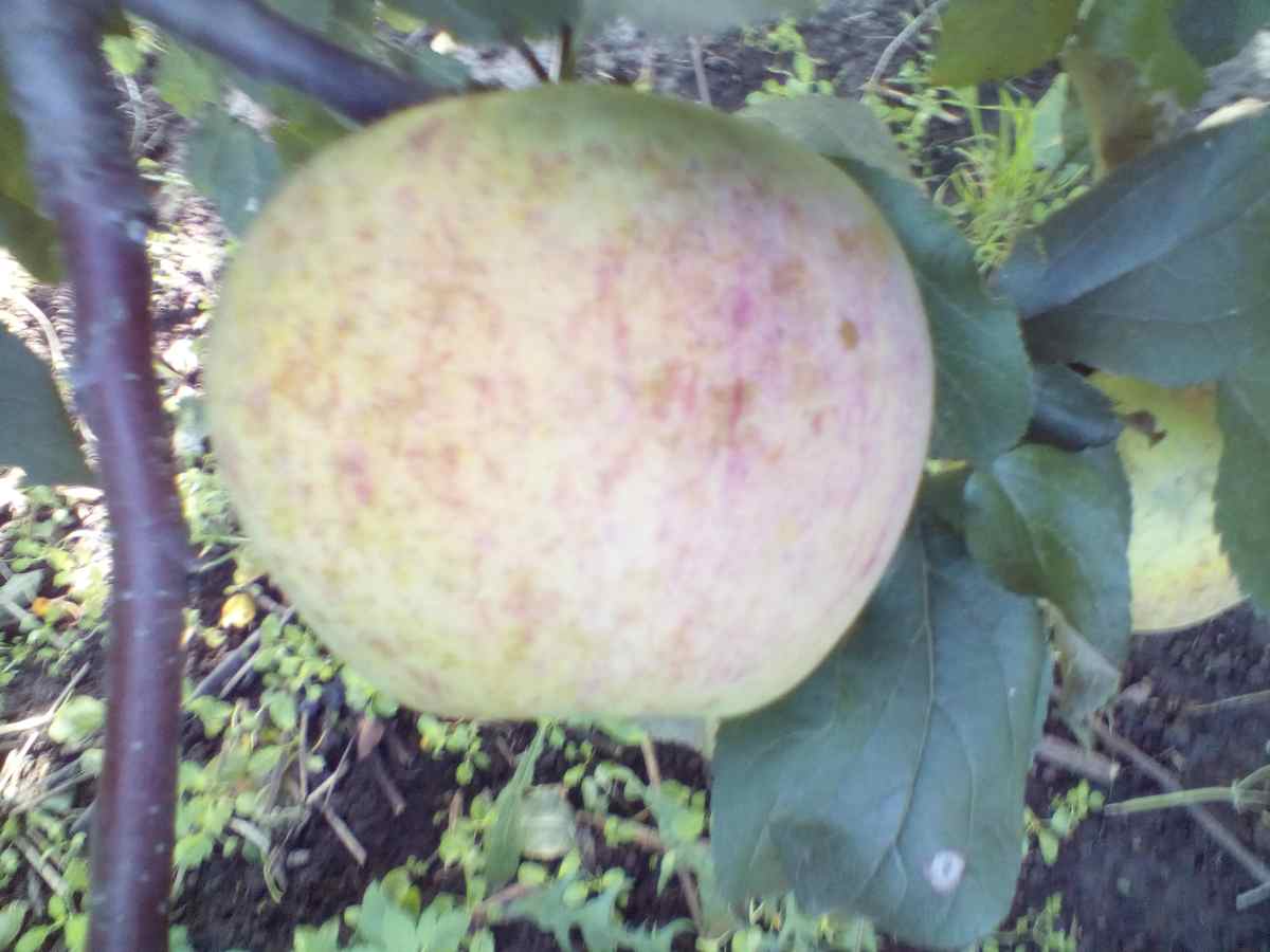 Бледно-зелёные с красным румянцем только на самых верхних плодах, воронка оржавлена немного как у голдена. Зимний, но плоды съедобны начиная с начала сентября. Сильно осыпается, но часть плодов висят на дереве и зимой, опадают только в оттепель.
