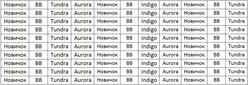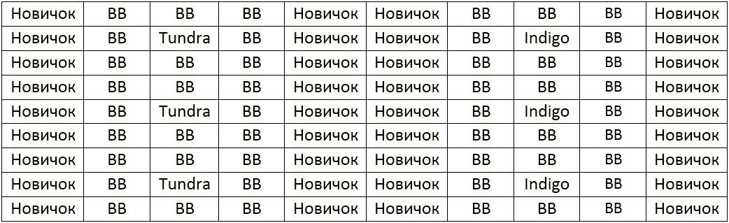 Таблица 1. Стратегия закладки плантации поздних сортов жимолости. Проблема данной стратегии в том, что первые цветы сорта Tundra никогда не будут опыляться и более мелкие ягоды сортов Tundra и Indigo будут смешиваться с ягодой Boreal Blizzard.<br />BB – Boreal Blizzard <br />Новичок – Перспективный сорт позднего срока цветения <br />Indigo – Indigo Gem<br />Indigo Gem и Tundra можно менять местами