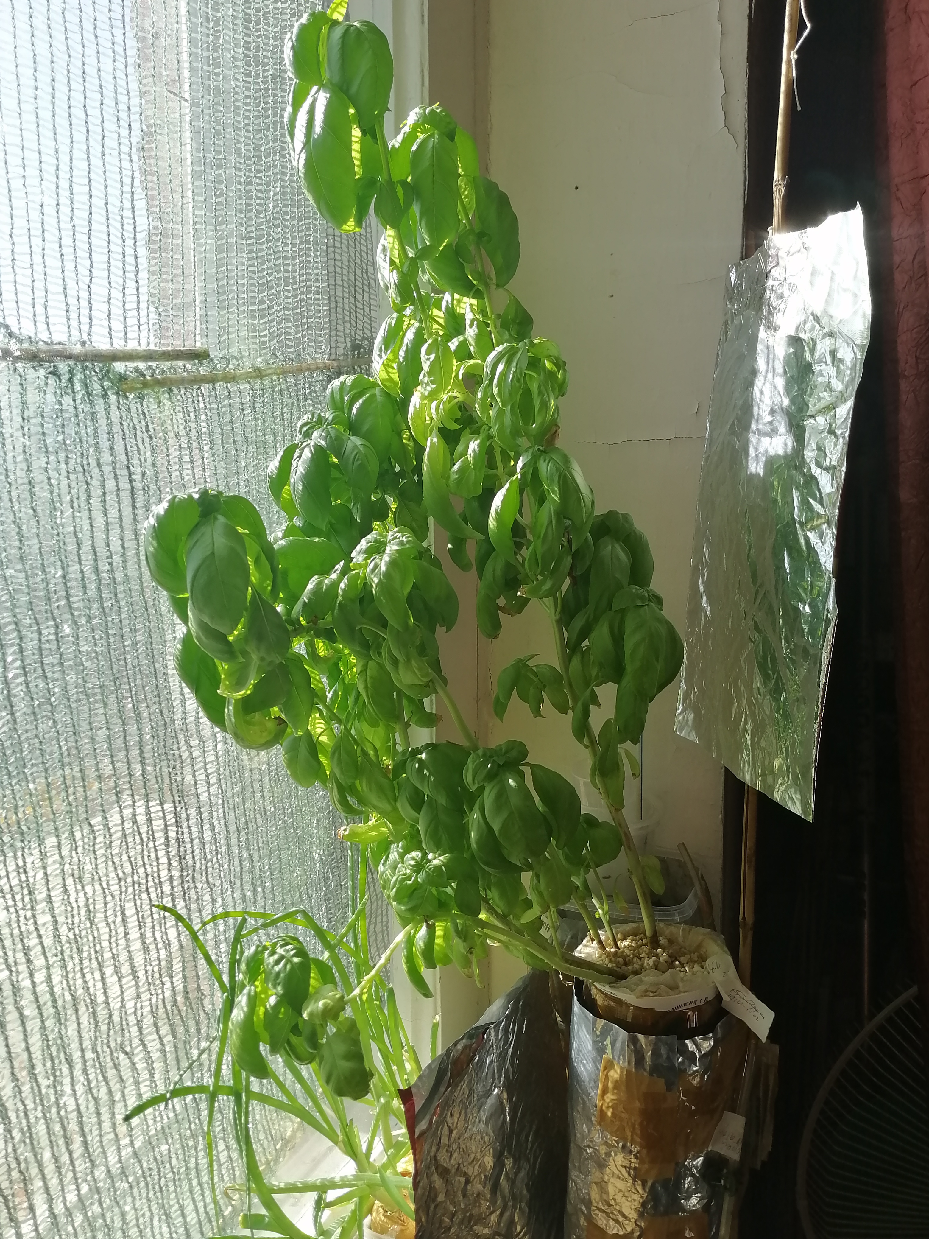 Прошлогодний базилик почувствовал Весну, зиму пережил и пошёл расти. Надо укорачивать, а то место много забирает. Ну он и водохлёб, по 500г в день.