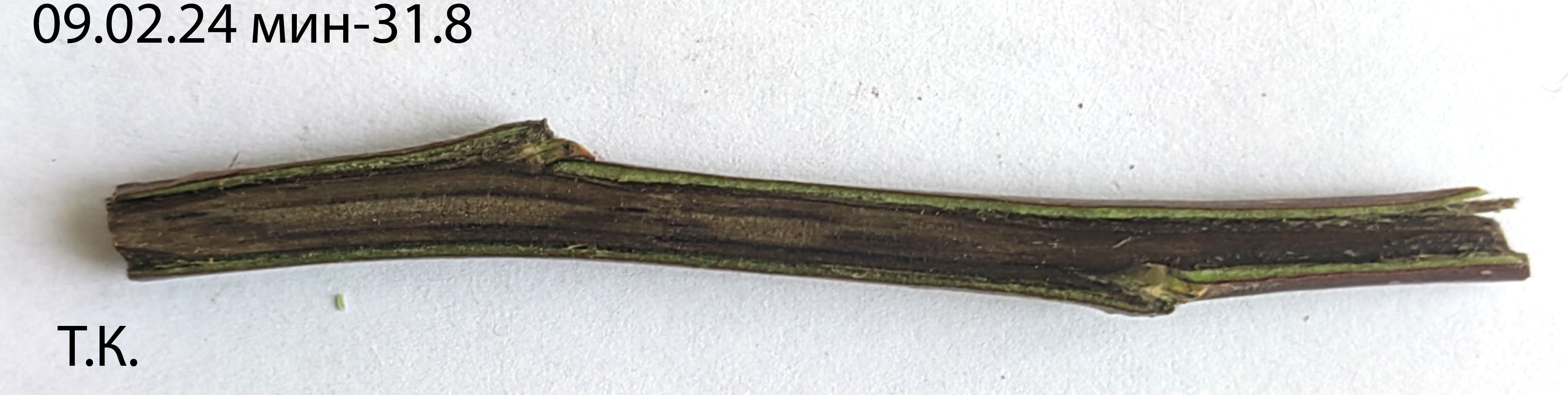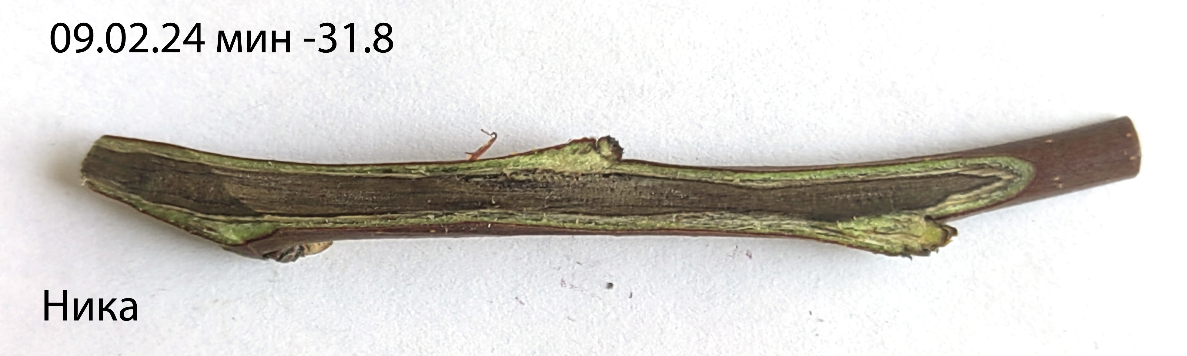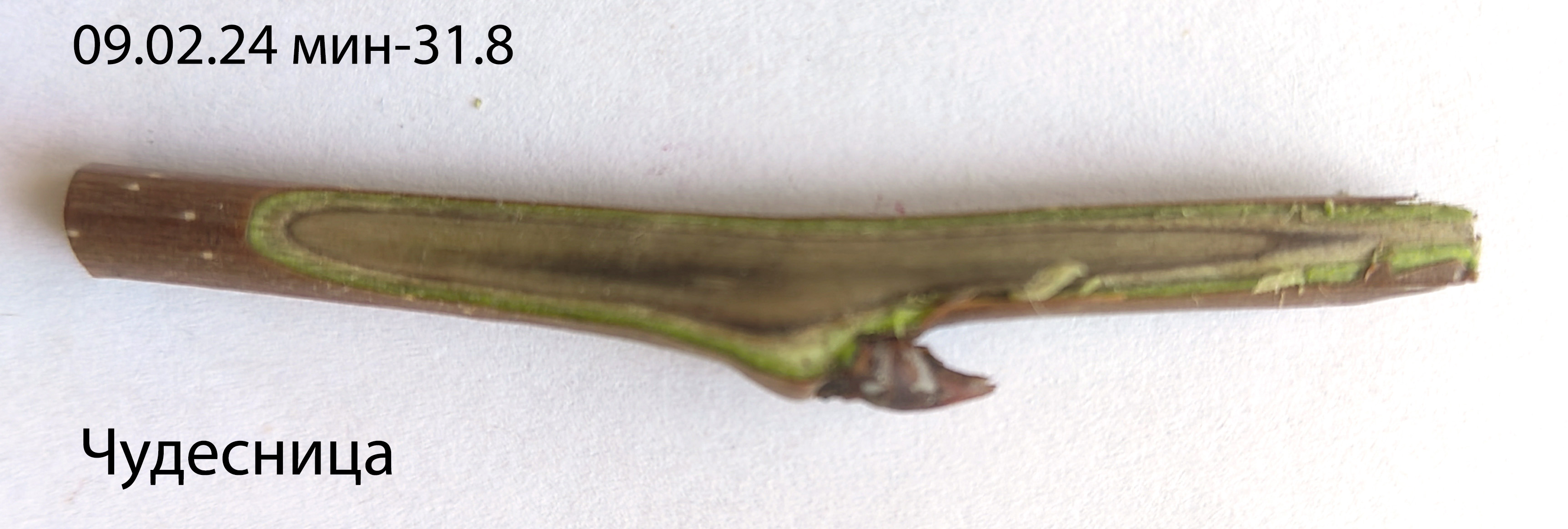 закралась ошибка. Так как Чижовскую почти перепривил, то срез сделал не с нее. Сегодня подошёл к этому моменту ответственней. Результат совсем другой. Все черенки Чижовской имеют зелёные срезы, без намека на потемнение. А в прошлый раз оказался прирост с августовской росы, который и сегодня имел потемнение.