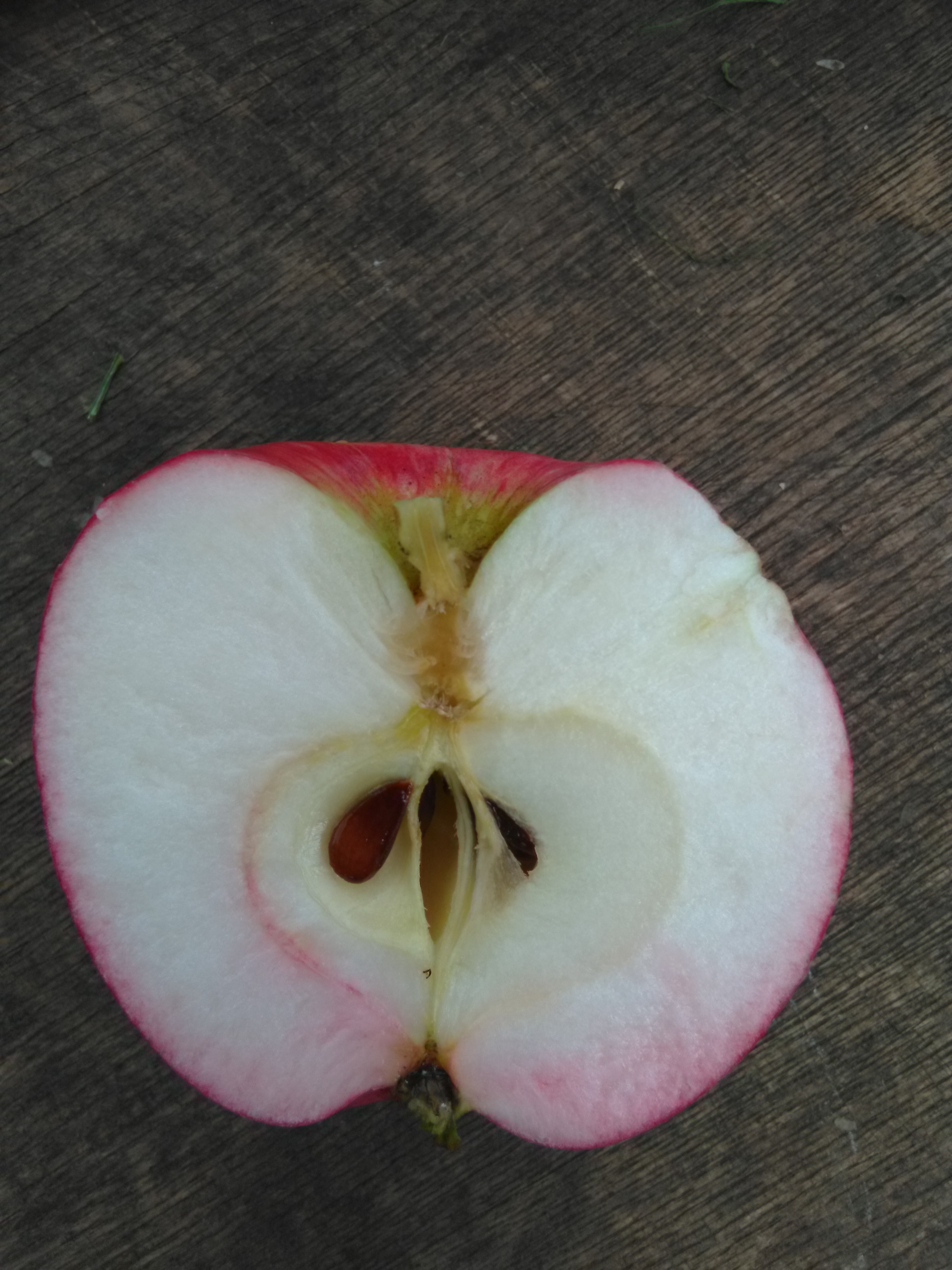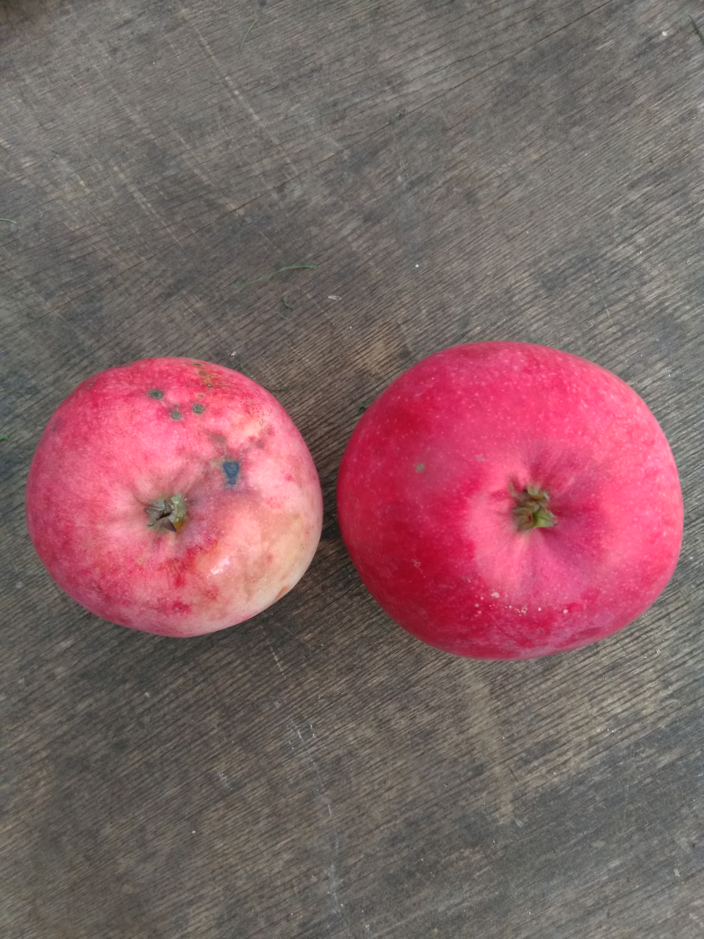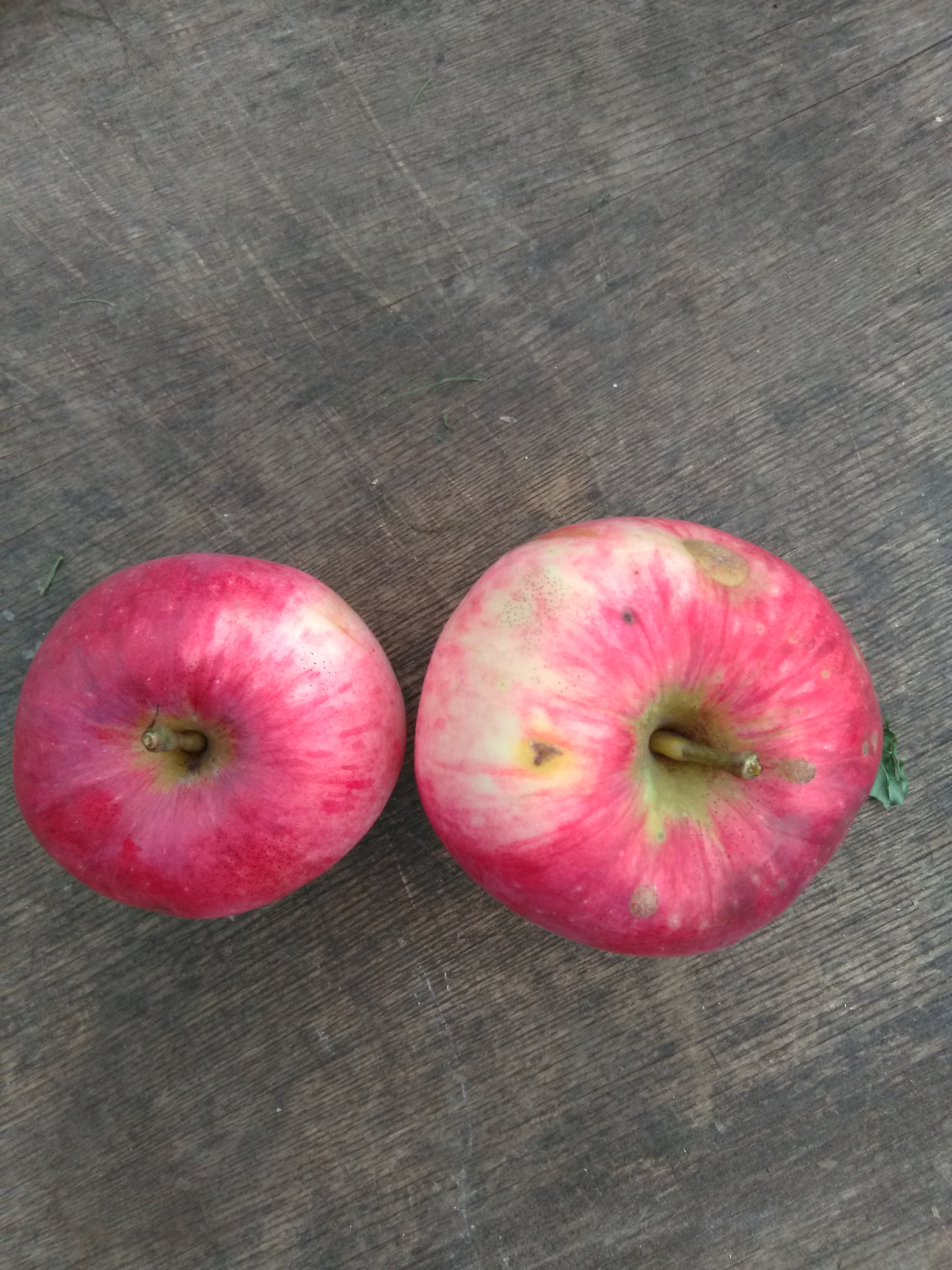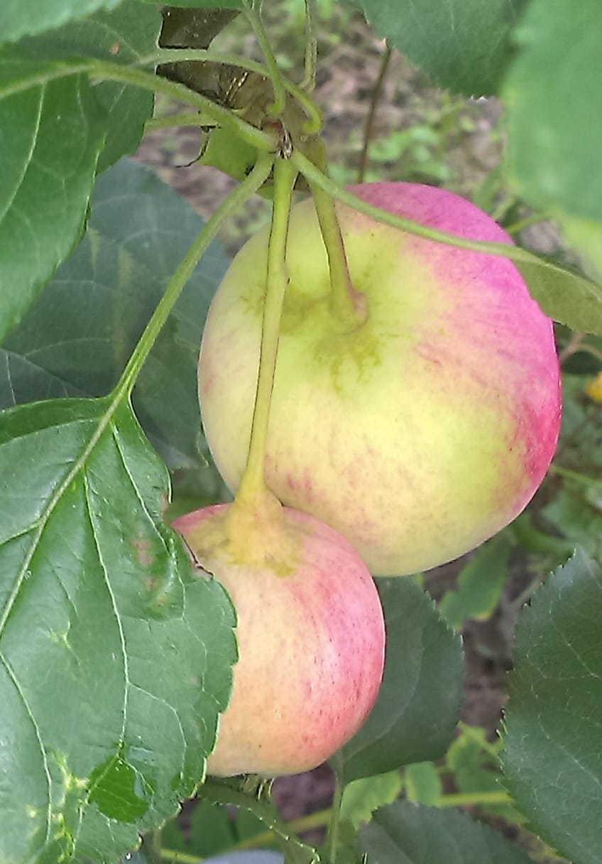 Сначала думал старая Грушовка Московская(дереву лет 50). Высота более 6 метров. Растет от земли тремя стволами. Не развалилась.Видимых зимних сильных повреждений особо не вижу. Выдерживает близкий УГВ. Плоды имеют сливающийся штриховый румянец бруснично-вишневого цвета увеличивающийся по мере созревания. Плоды слегка плоско-округлые. Мякоть даже у падалицы жёсткая в отличии от настоящей Грушовки, та и трёх дней не пролежит, если упадет - все в кашу. Эта по прежнему жесткая. Плодожоркой и паршой повреждена умерено. Диаметр плодов(похоже измельчали с возрастом дерева) в среднем около 6 см. Вкус насыщенно сладко-кислый с лёгкой терпкостью и пряностью. Аромат от пакета с яблоками сильный яблочный слегка пряный. Сорт явно не летний, хотя созрел и осыпается. Три недели назад были кислые, неделю назад начали резко созревать и осыпаться. Семечки темные, черно-коричневые, довольно крупные, слегка граненые.