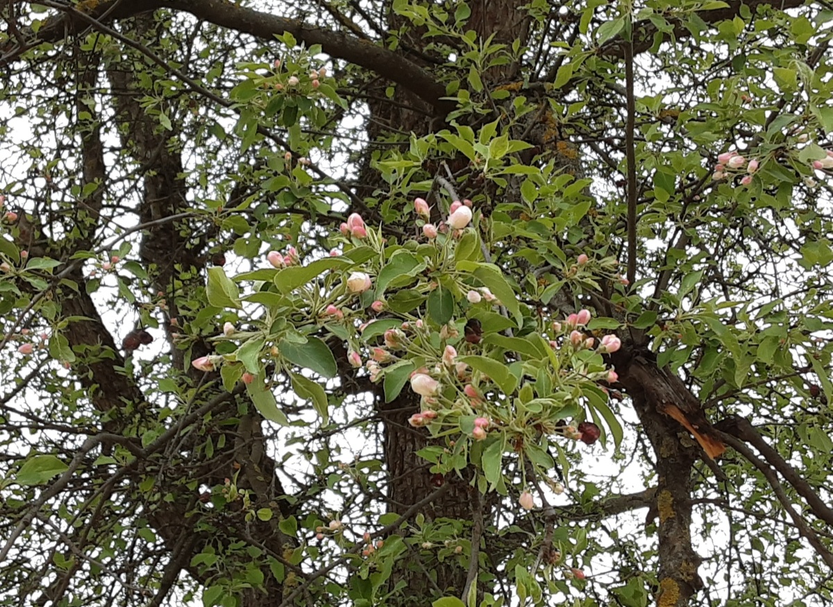 Хорошо перезимовали саженцы Ред Фуджи, Морнинг Мист, Хокуто (зацветает).