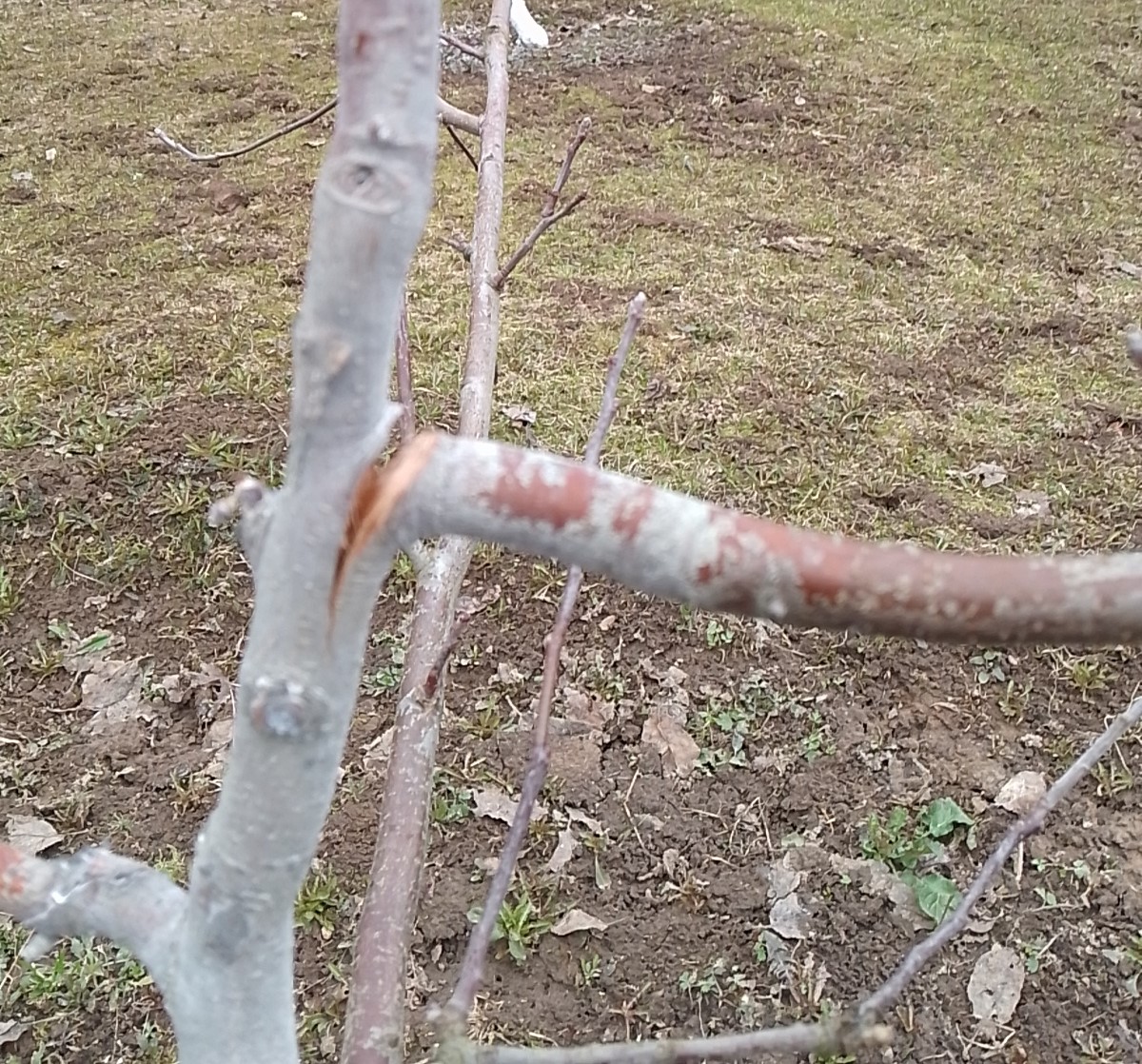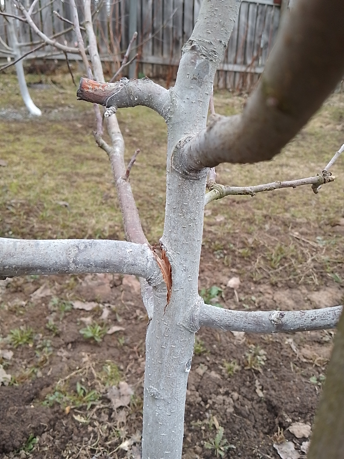 А у меня, помимо прочего, еще и последствия сверхснежной зимы и скоротечного таяния снега в конце марта. Пострадала Лада, которая осталась без скелетных ветвей. Раны постараюсь залечить с надеждой, что проснутся спящие почки и удастся восстановить нижний ярус. А с Имрусом дела еще хуже. В прошлую зиму пострадал штамб и вымерз проводник. А в эту зиму вот такое. Раны довольно критические на всех основных скелетных по кругу. Можно было, конечно, попытаться кое-что спасти. Коротко обрезать ветки, притянуть их и зафиксировать. Может быть что-то и прижилось бы (положительный опыт такого имеется). Но, по совокупности всех повреждений, решил обрезать на обратный рост ниже морозобоины опять же в надежде, что какая-нибудь спящая почка имеется в наличии и выстрелит или...Но что интересно. Когда я 26 марта смог (откопав 130 см слой снега у калитки) в первый раз в этом году войти на участок, где еще снега было около деревьев от 20 см до 70 см, то увидел следующую картину. Практически все нижние ветки у деревьев были в снежном плену. Снег был настолько мокрый и плотный, что освобождать ветки приходилось с большим трудом, порядка пару часов понадобилось довольно тяжкого труда. Причем некоторые ветки концами снег тянул за собой под углом 90 градусов! Никогда за 8 лет такого не было!