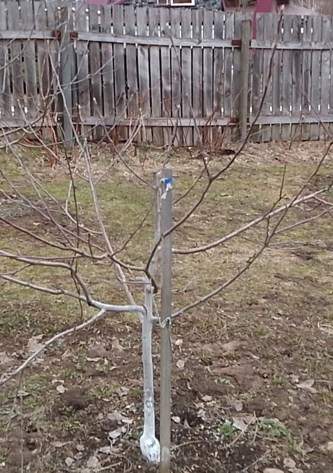 Амброзия - осенняя посадка 23 года. Коннел Ред 22 года - Подмерзание верхушки... Остались небольшие живые участки выше прививки. Зимой все было под снегом. А осенью, перед первыми заморозками, саженец замотал дышащим материалом от земли до макушки.