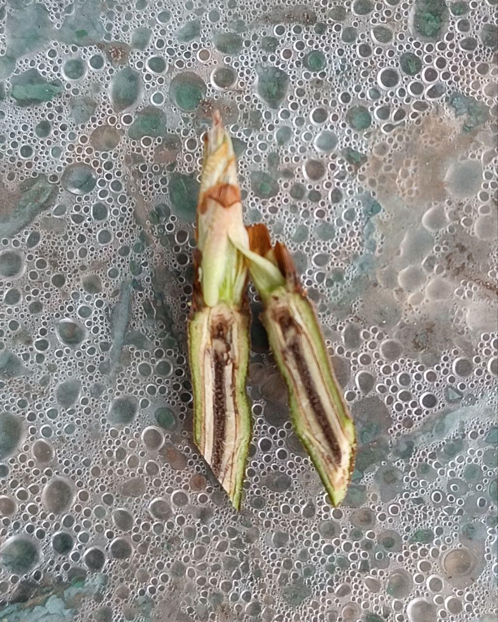 Сами сеянцы дички (2х летки) - в тёмных пятнах по коре, как будто б мороз по ним ледяной дробью шмалял, но на срезах - чистенькие по всему.