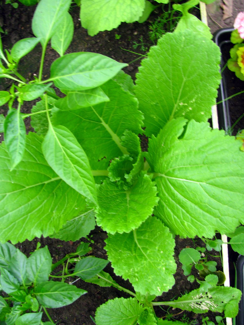 Я ж свою Пекину посадила в теплицу рассадой. И ещё семена рассыпала. Семенами которая уже догнала рассадную. Такие здоровенные кусты, но только начинает закручиваться. Бедные помидоры в тени оказались.