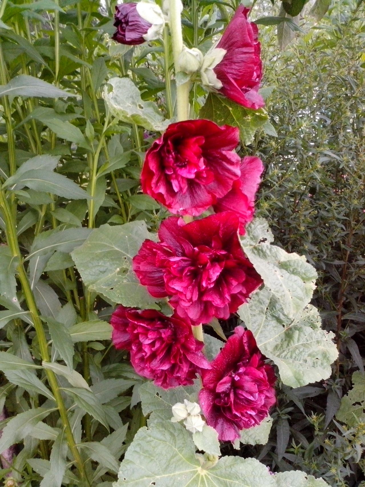 Так может так и сделать - слева - бордо (что там цветёт высокое с розами - мальвы махровые