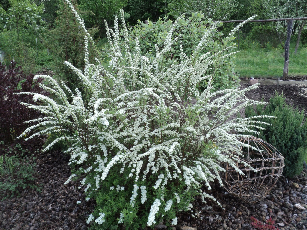 И тут же мысль о кустарниках. Марин, не хочешь в этот цветник кустарник? Не думала? Три метра позволят. Только цветные (типа Дьяболо, жёлтолистных, вариегатных) не вижу. Будет яркая каша, что не нужно... А вот спирею Грефшайм вижу