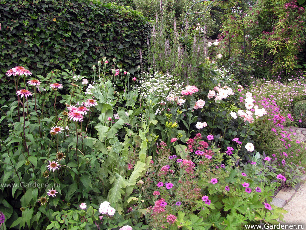 Очень понравилась фотография партера Люси. 434 сооб.. Прям, иллюстрация к тому, о чём со Шведкой - Светланой говорили. О том, что для партера - отлично, тяжело будет восприниматься "куском" на небольшой "клумбочке". Но композиция - очень "поучительная" - ну вся "кухня" показана. Вот смотрите, нет сочетания розового и жёлтого, розового и оранжевого, потому что они считаются у "них" "безвкусной смесью, лишённой чувств". Но для гармоничности добавлены и белый, и голубой(чистец?), и серебристые злаки. И фон, конечно, эффектный газон. И для контраста с розовым перилла(или колеус) вишнёвый и тёмно-красный - монарда. Картина!