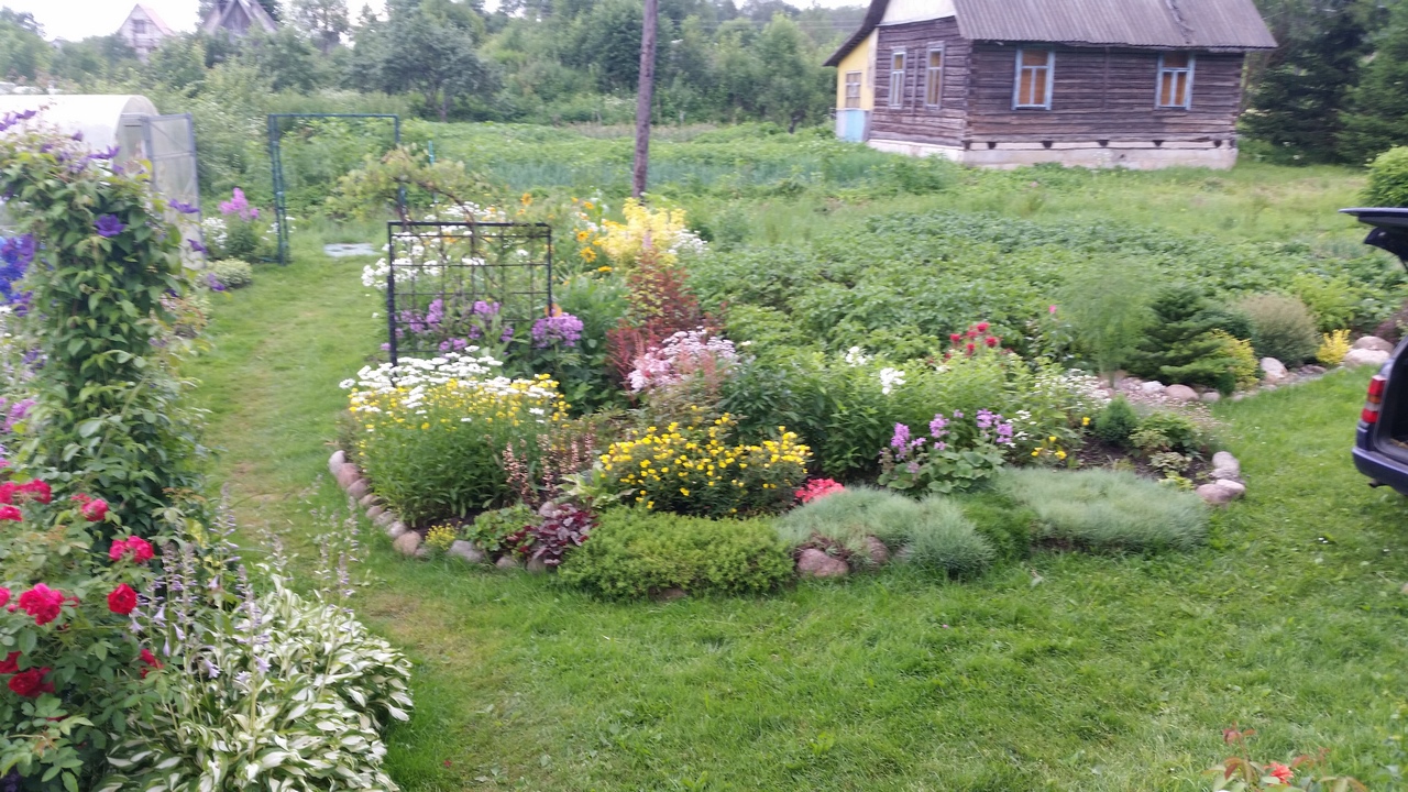 Я пересадила бы дёрен (Элегантиссима) от этой клумбы, зачем загораживать обзор цветов? Может его уже там и нету? Я б его лучше к забору отнесла или посадила у края огорода, там где белая конструкция стоит.