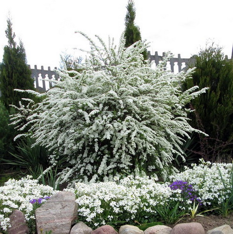 И смотри: к белой розе Свани, чуть позади нее посадить синие ирисы . Спирею не в середину,а чуть правее. Тогда перед ней окажется стелющийся можжевельник. А по бокам от спиреи,отступив назад к дому,две колоновидные узкие туи.Свободные места заполнить куртинками лобелии(есть семена темно синей и синей с белыми вкраплениями). Кучечками ее посадить.