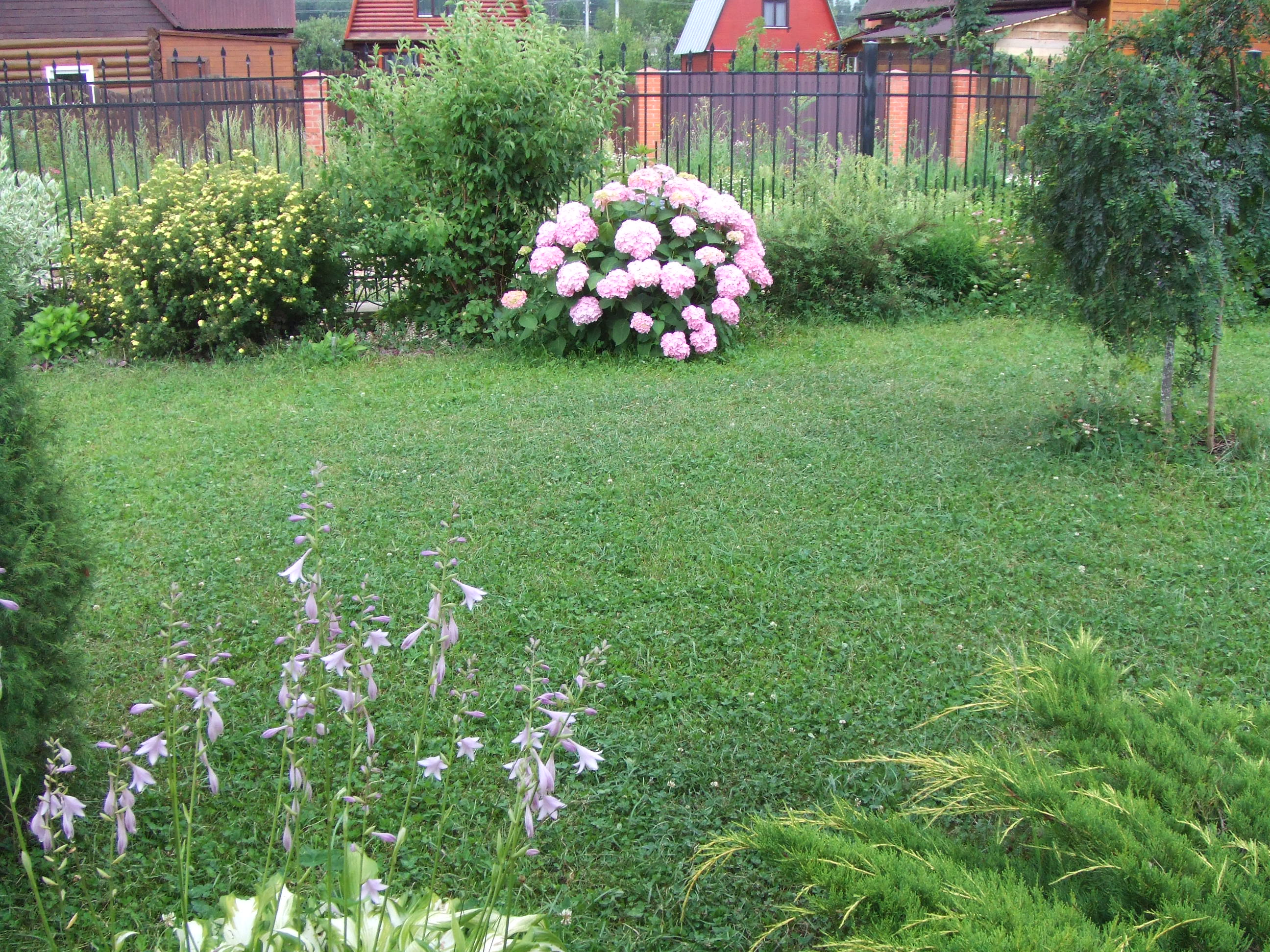 Красота у вас!!! И газончик густой, ухоженный, англичанам поучиться! А что за сорт гортензии? Неужели крупнолистная?