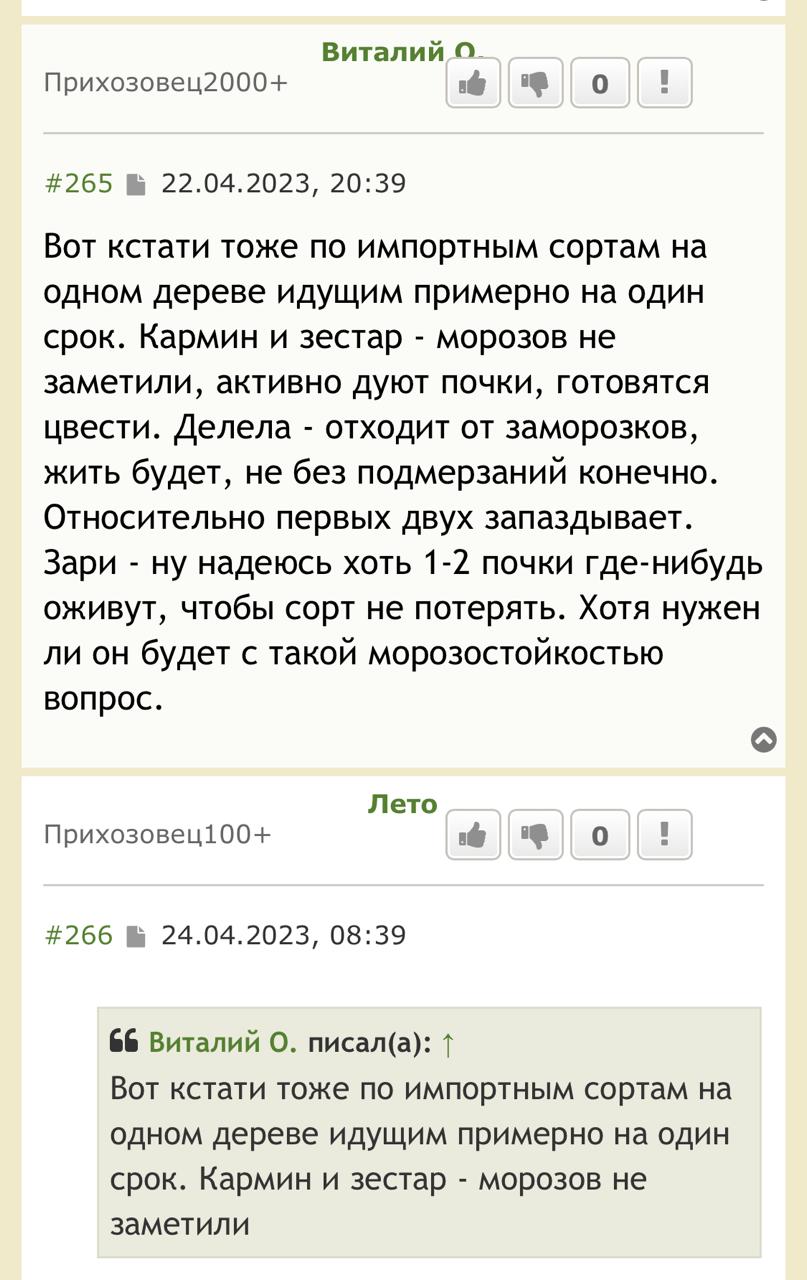РоманТ92 писал(а): ↑08.06.2024, 15:00Вы уверены в сортосоответствии? У меня есть под наблюдением 2 саженца Зестара от Андрея Васильева - 1 у меня и 1 у соседей. Оба перезимовали без нареканий, а соседский даже выдал 4 цветка. В минувшую зиму морозы в начале декабря достигали -35 по ночам несколько дней точно.tep писал(а): ↑07.06.2024, 13:32 Вылетела прививка в крону Зестар(привет тем кто утверждает о его хорошей зимостойкости,прививке 5 лет,но нормального урожая мы так и не видели на ней,причём по ветке пошёл чёрный рак,сорт не устойчив к нему и -30 гр ему приговор,причём остальные сорта на этом дереве без повреждений чёрным раком)Я то уверен,он у меня уже плодил.А Вы уверены в сортности?У меня он появился в то же время что и у Андрея Васильева.Практически каждую зиму получал повреждения от заморозков и в эту зиму проявился чёрный рак и он засох.Вы заметили что никто не показывает плодов данного сорта именно на дереве,хотя сорт давно гуляет по нашим сортам,его к нам завёз Игорь Муравьёв который Весна.Я никогда не буду говорить про соответствие сорта пока он не заплодит у меня.