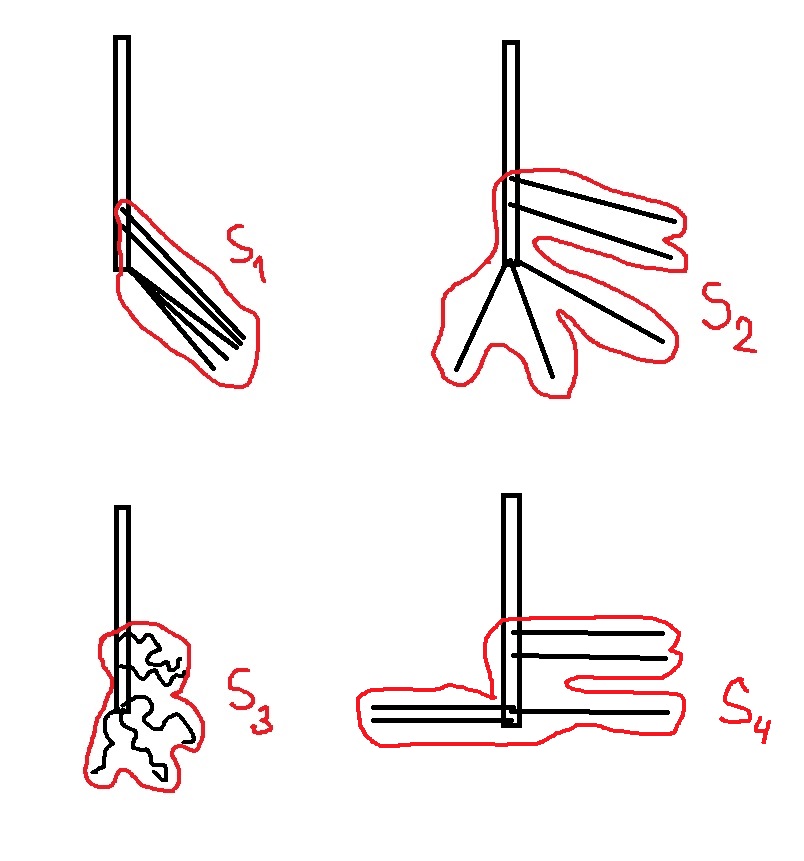 Мне кажется, мы говорим о разным площадях. Вы - о проекции корней на поверхность грунта. Я - о площади рабочей поверхности корней, которая не зависит от угла укладки. Набросал для понимания. Вариант 2 я считаю оптимальным расправлением, там же мы и получаем максимальную площадь всасывания корнями. 4 вариант - Ваш, по площади всасывания будет равен варианту 2, но такие углы расположения меня смущают, о чем выше и говорил.