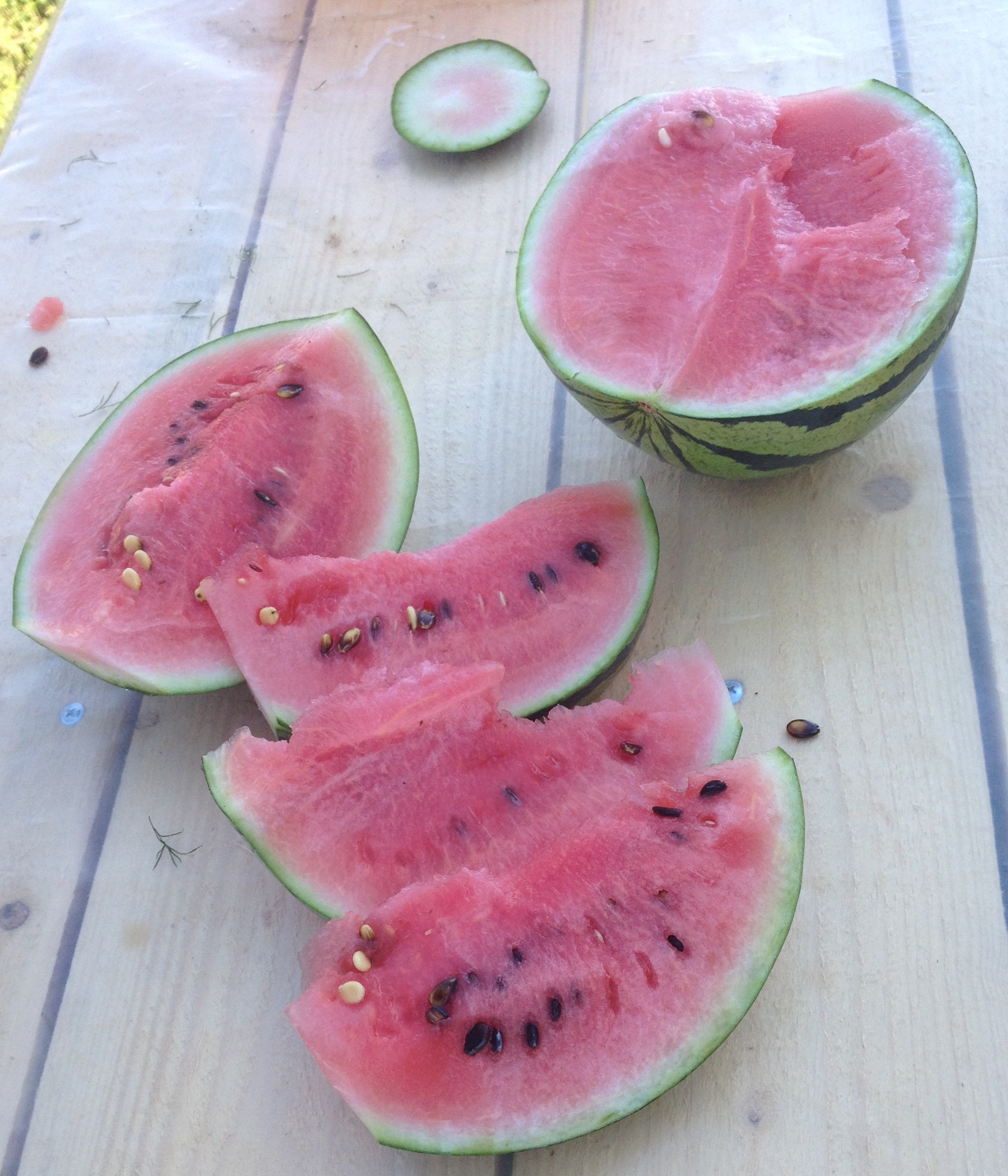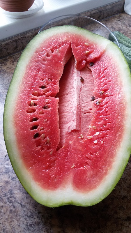 Пусть не очень большой, но нам достаточно. Главное вкус. Он оказался очень вкусным! С момента опыления прошло 2 месяца, а от размера с грецкий орех - не меньше 55 дней.Очень боялась, что перезреет, но нет - сладкий, хрустящий! Усик и хвостик оставались зелеными, определяли по звуку. Мы с мужем очень довольны, надеемся, что и другие арбузы нас тоже порадуют.Есть еще 2 арбуза опыленные тоже 16.06 - Кай и Сибирские огни, но мне кажется, что еще они не совсем созрели - стук глуховатый. Хочу чуть подождать, потом сорвем. Может быть холодная погода не давала им созреть вовремя. А остальные арбузы опылились попозже, но может быть все таки успеют вызреть.