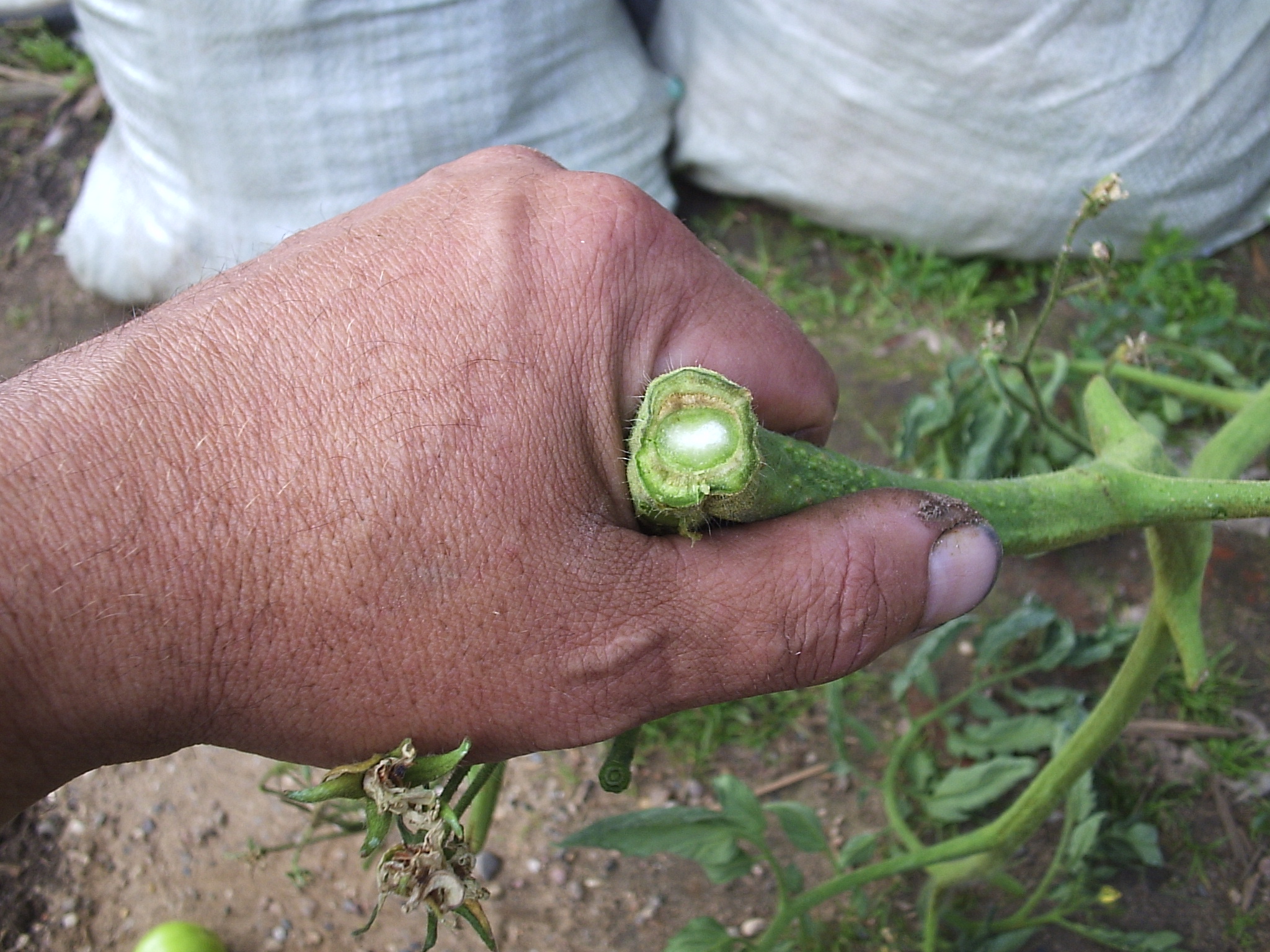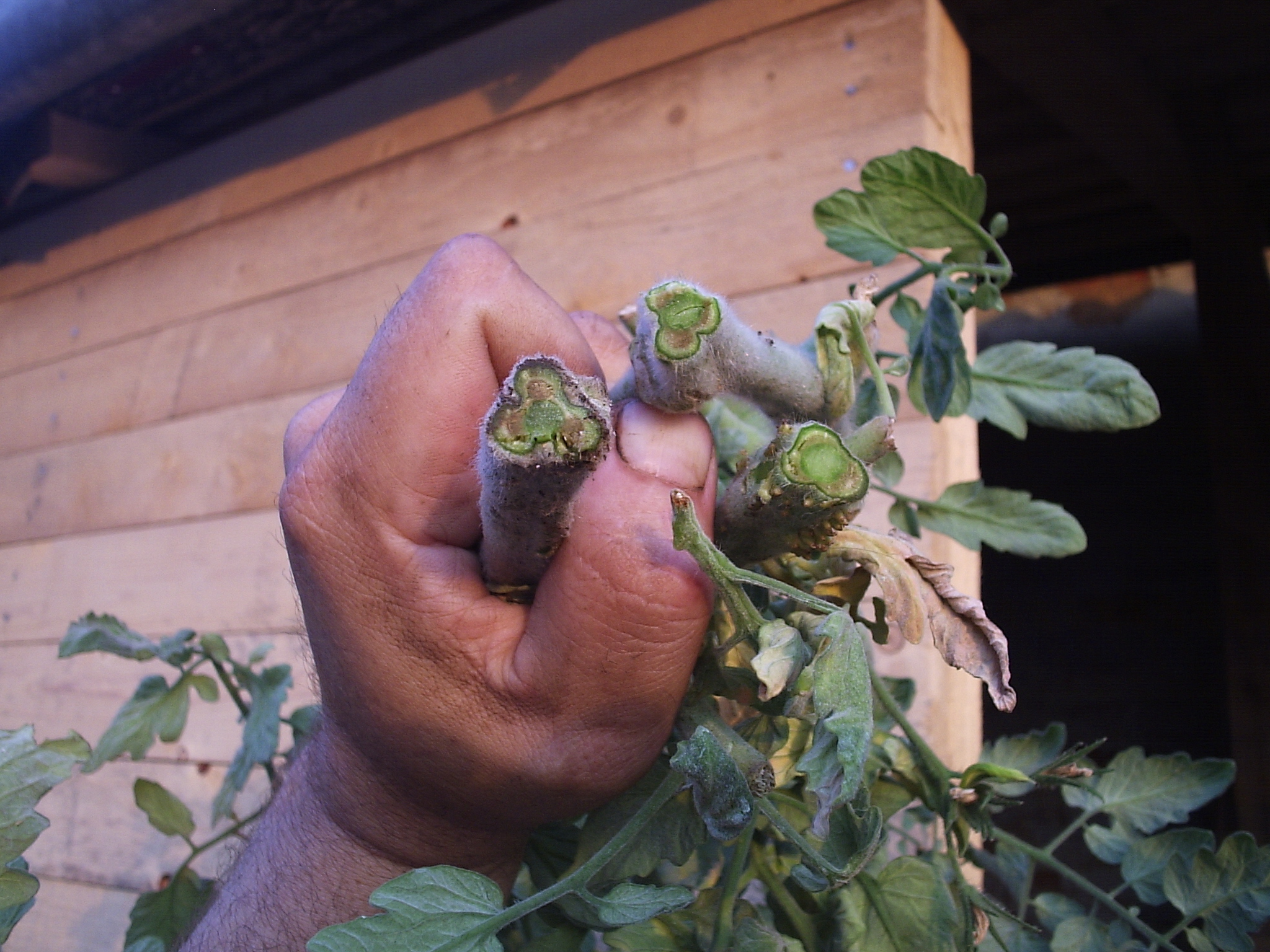 Стебель его у самого основания лопнул и разошелся , наверно это место даже чуть было в грунте , иначеб раньше заметил Но вот потом решил разрезать стебель ближе к первой кисти , а там вот такое омертвение секторальное наблюдается Может это все же фузариоз или что подобное на последней стадии ?