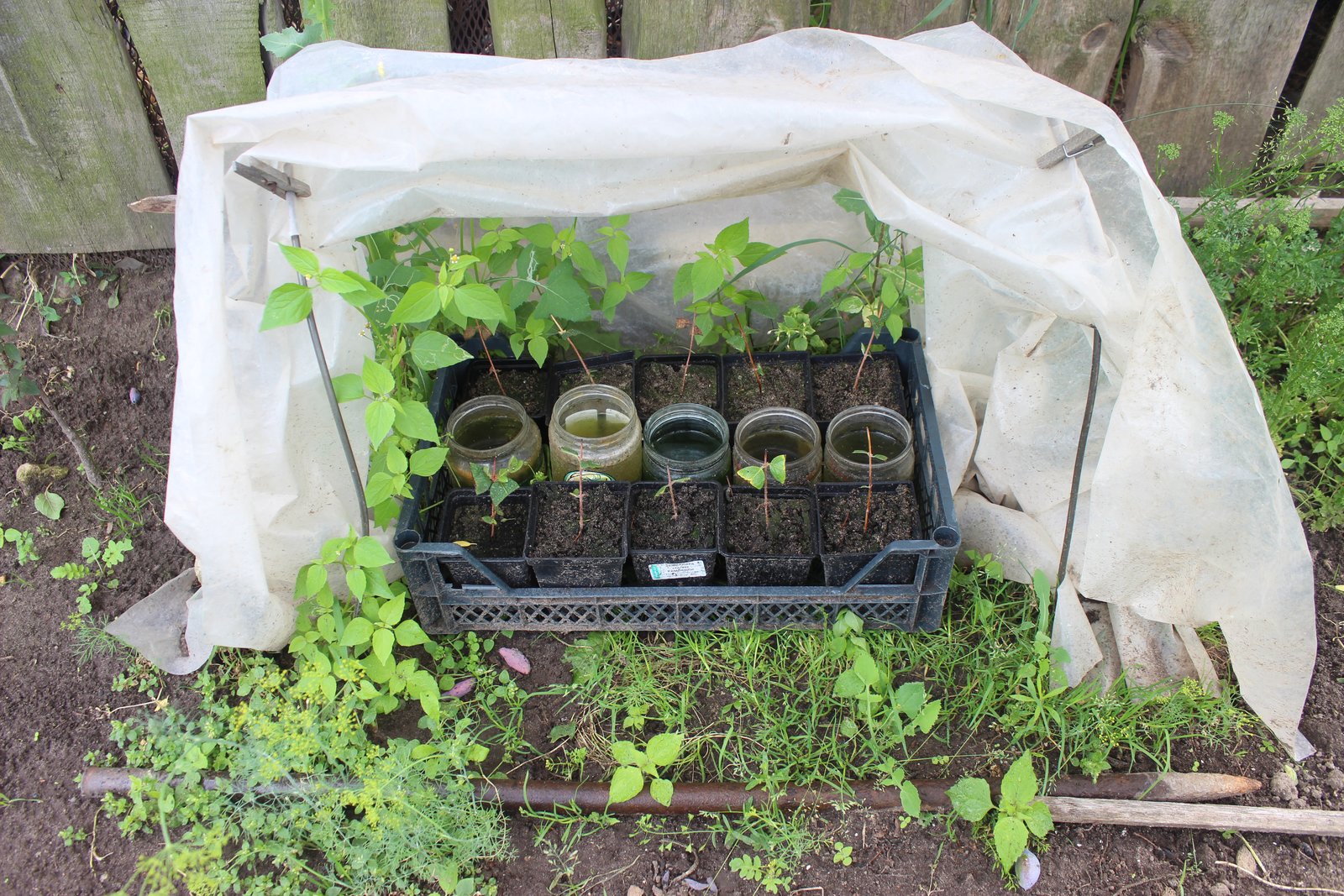 Разобрал сегодня свой череночник. Хоть Брыксин в статье и говорил что нужно в парнике держать 1,5-2 месяца, но как-то страшновато. Грунт уже весь зеленью пошел, боюсь что даже если корневая и образовалась, то загниет. Непредвиденный фактор у меня сработал - лягушки. Их у меня много и очень они любят места с повышенной влажностью. Под кирпичами/досками, в теплице. И вот мой череночник облюбовали, плескались в банках с водой, шастали по горшкам как слоны. Приедешь, а черенки валяются. Из 10 горшков в двух черенки засохли. Оба в дальнем ряду, он как раз от лягушек больше всего пострадал. Один черенок укоренился, по остальным пока непонятно. Будем дальше смотреть.