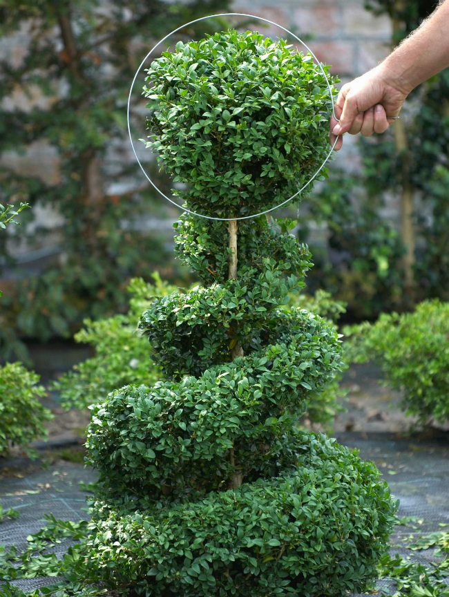 Дизайнер Воронов В.А. советует так делать форму шара: в средней части кроны выстричь "экватор", потом несколько "меридианов" и, уже ориентируясь на них, продолжать стрижку. А спиралевидную форму... Молодое дерево наматывается на палку. А взрослое - обмотать толстой верёвкой и выстричь всё вдоль верёвки.