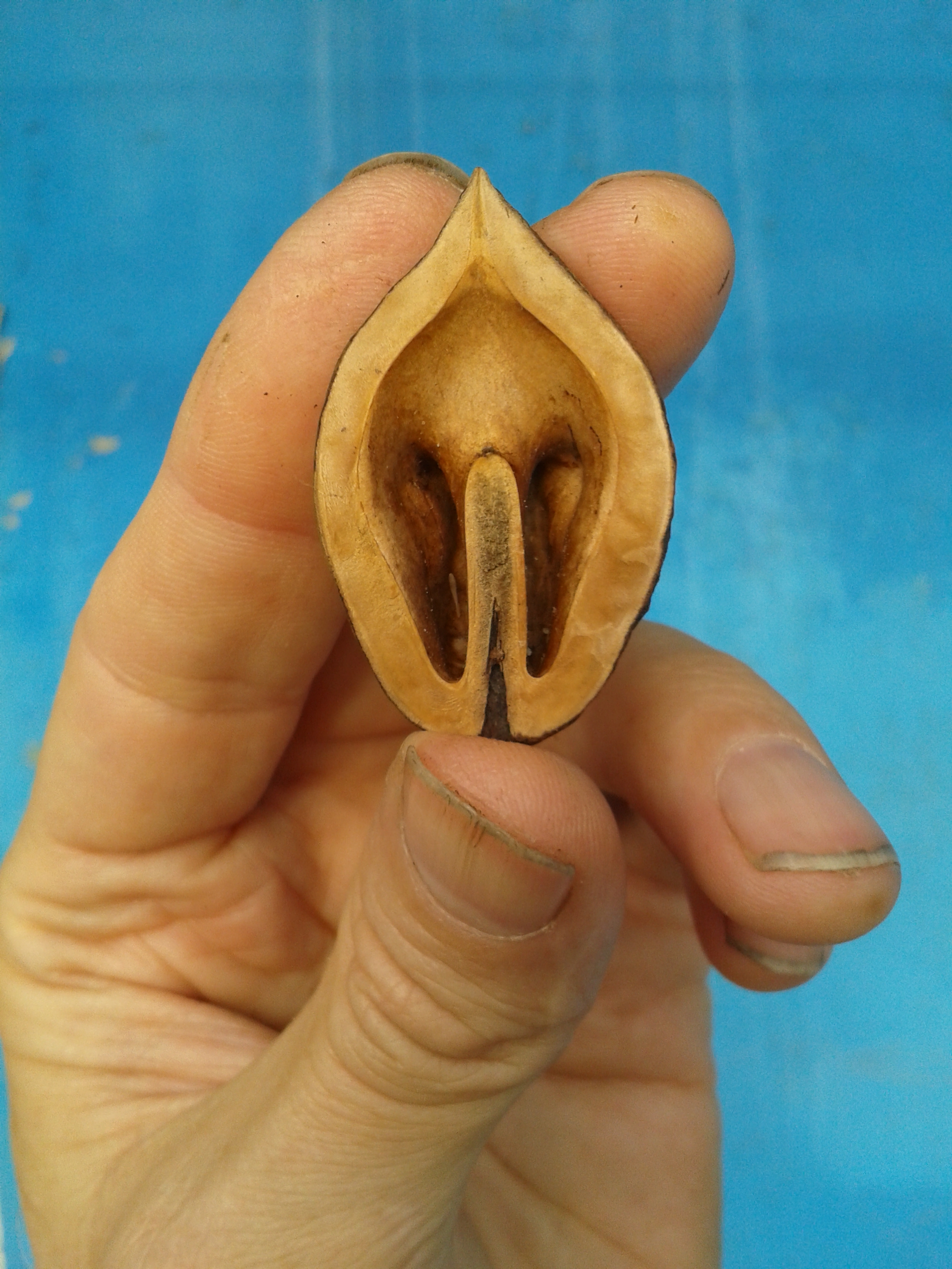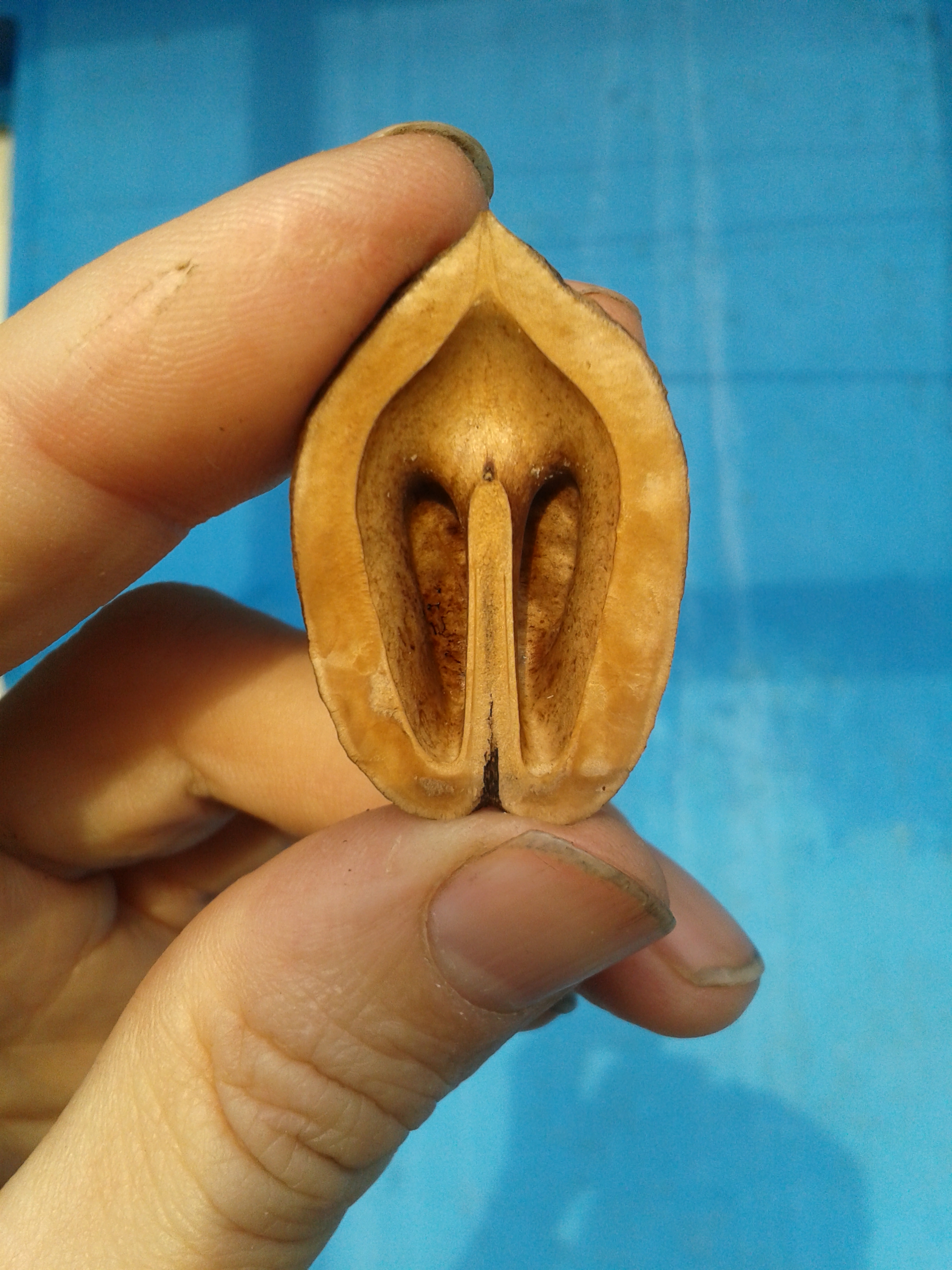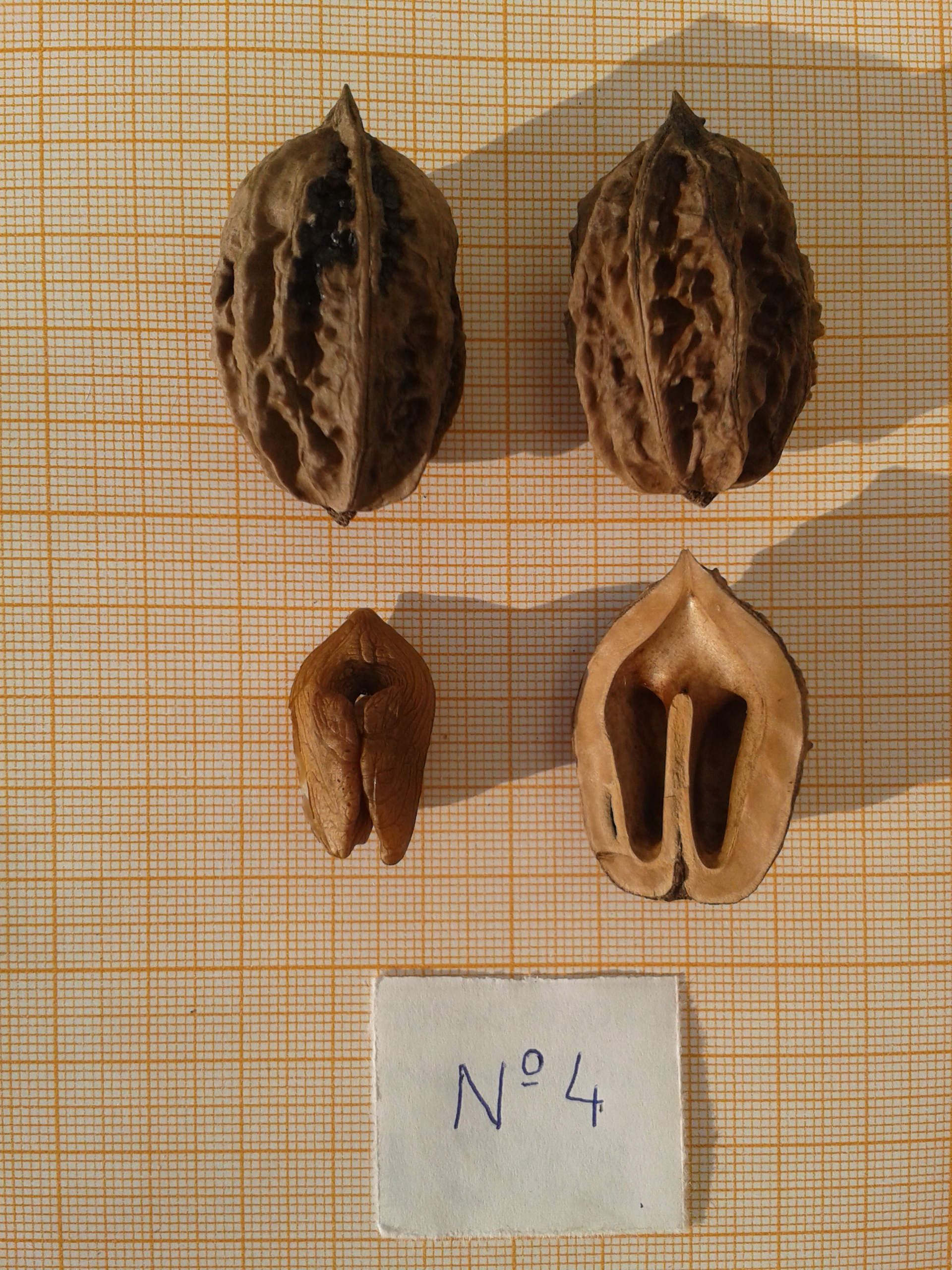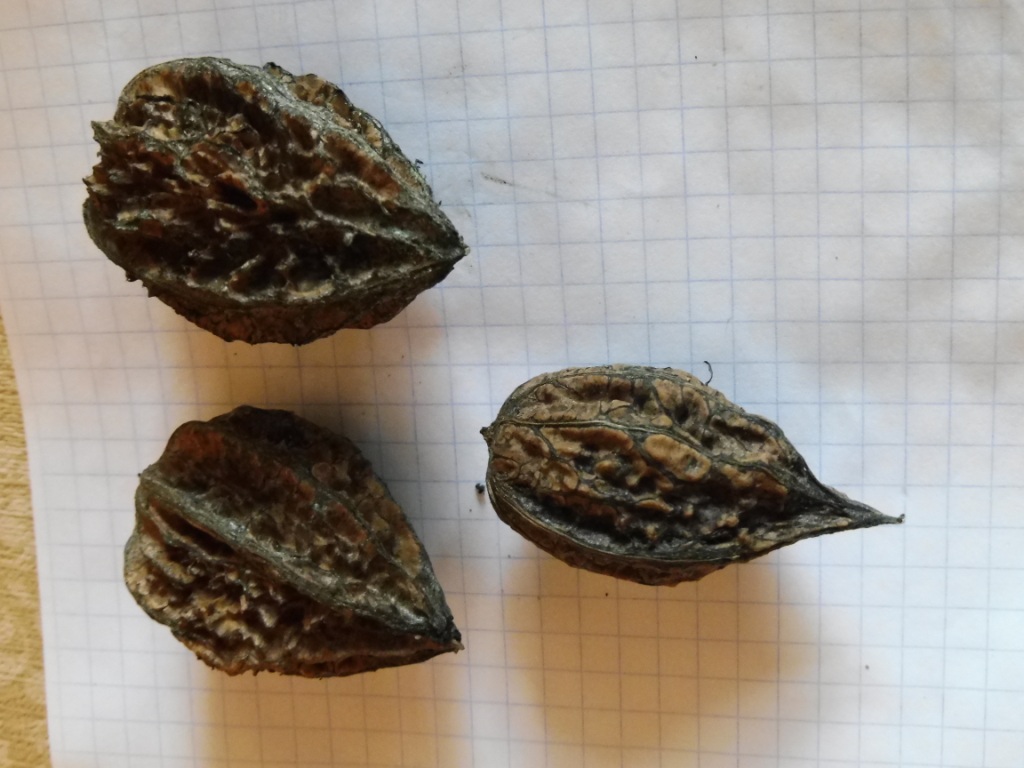 Орех среднего размера (ближе к крупному). Ядро полновесное, при колке извлекается крупными кусочками (раза три удалось извлечь почти целиком). Полости расширенные. Термическим способом извлек ядро у одного из пяти орехов. Полости расширенные, но не слишком широкие. Часто неправильной формы, что затрудняет извлечение ядра термическим способом.