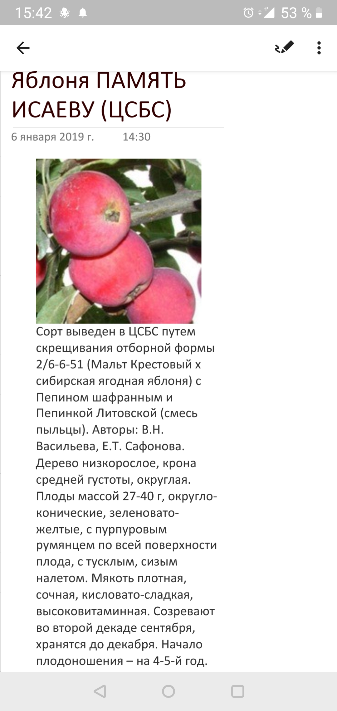 Другая Память Исаева - Авторами этого гибрида стала целая группа Всероссийского НИИ селекции плодовых культур во главе с Е. Н. Седовым. Путем скрещивания сортов Антоновка краснобочка и гибридная форма SR 0523.