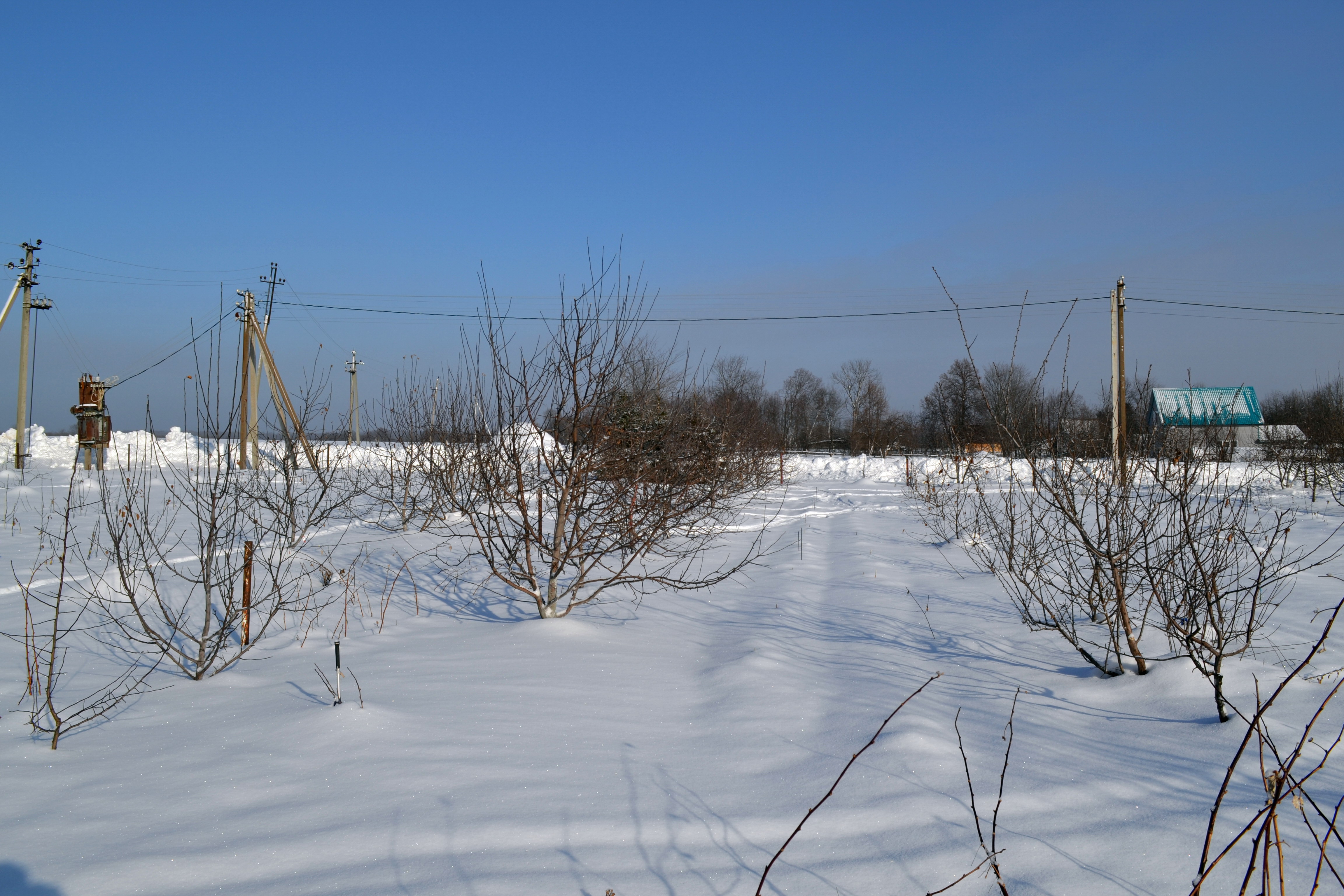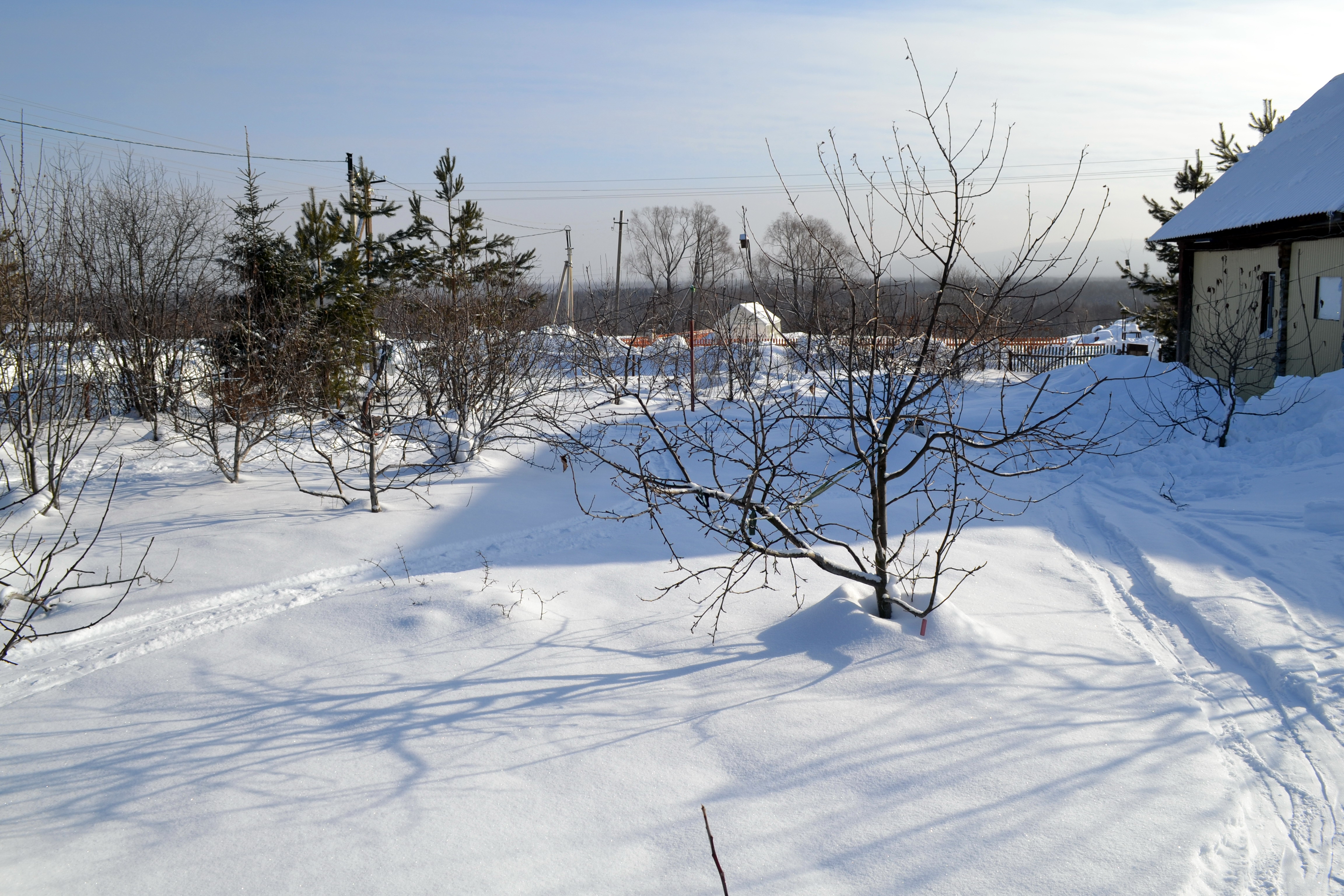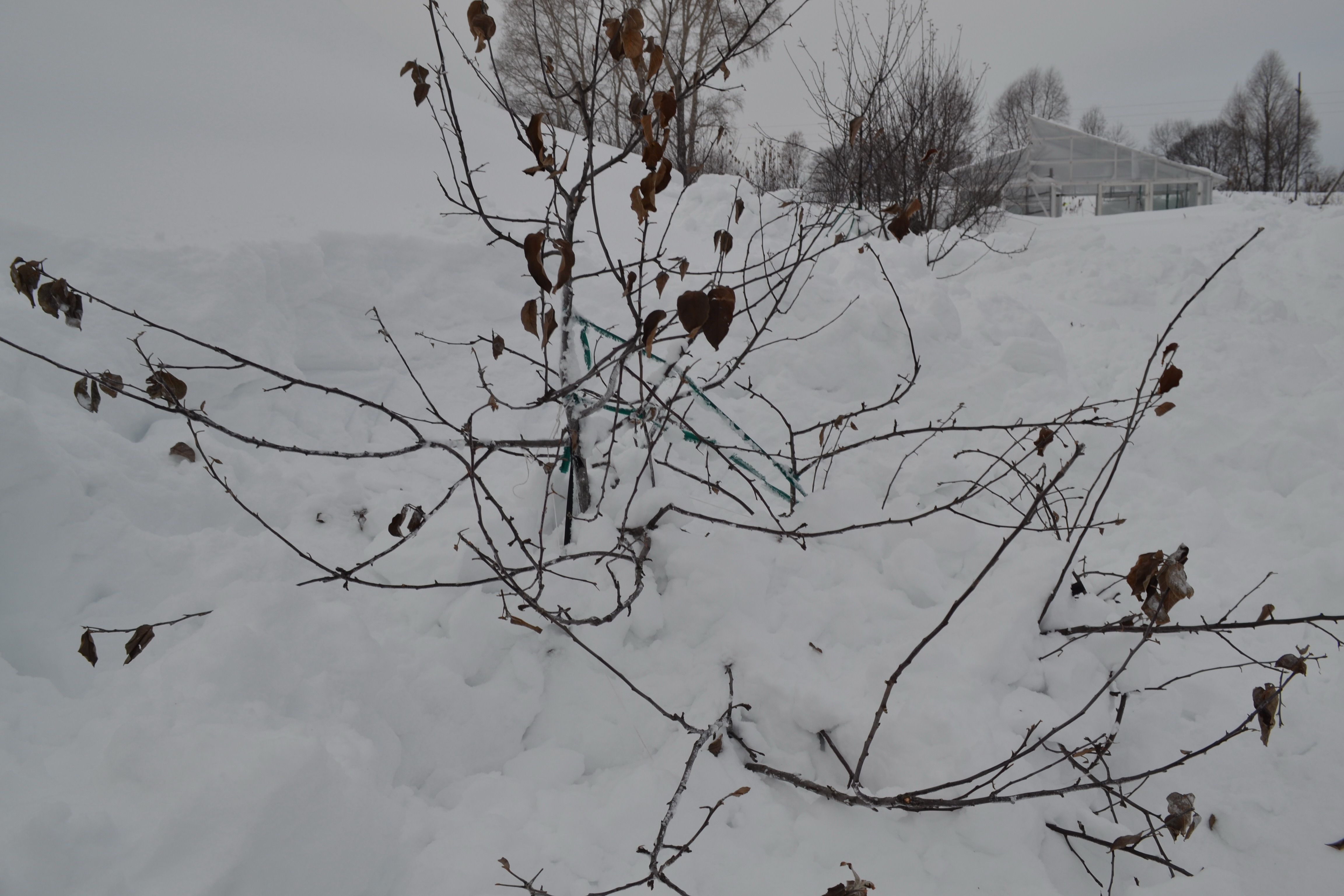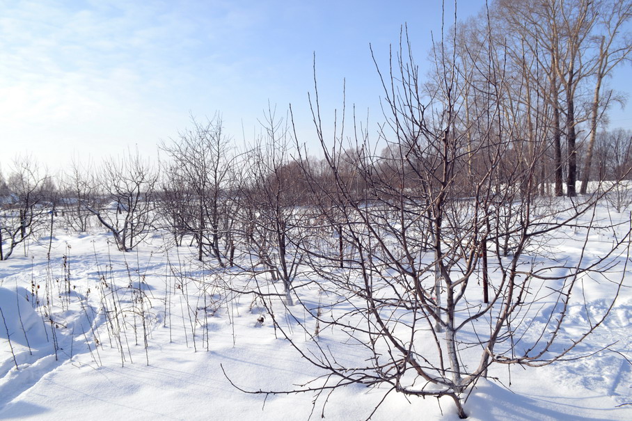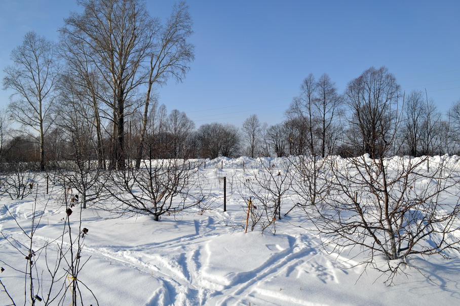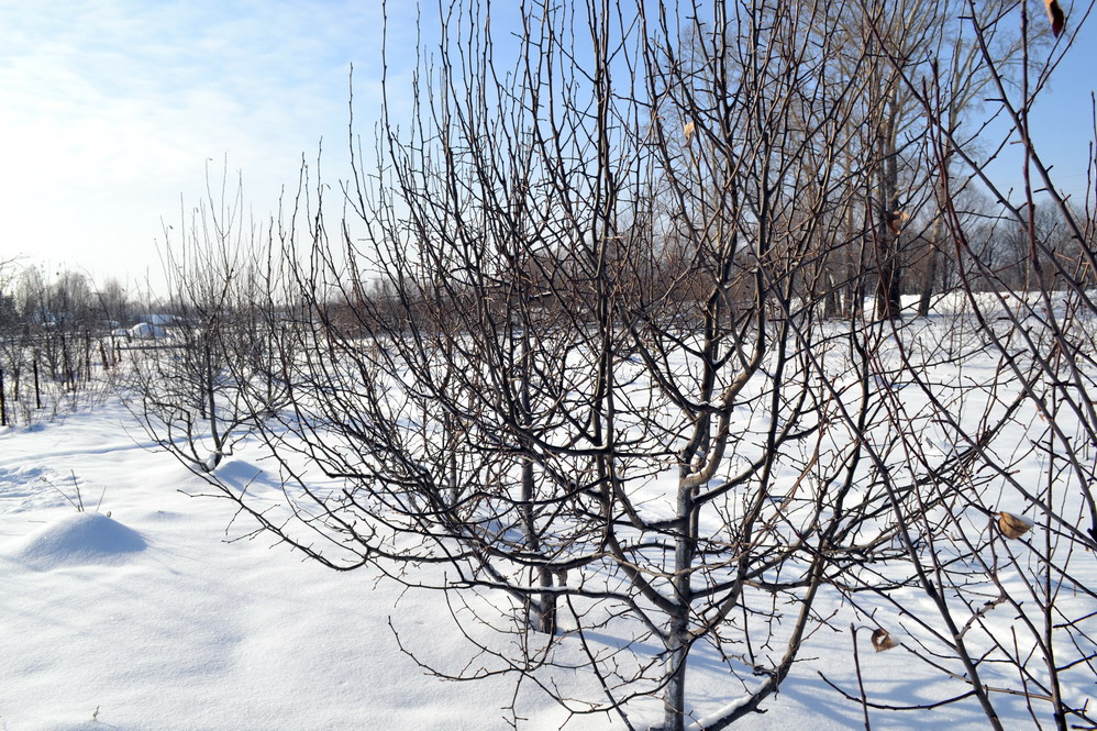Я говорил, что среднезимостойкие сорта прививаю в проводник на высоте 2 метра. А штамб у деревьев стандартный. Первый ярус чуть ниже высоты снежного покрова, чтоб места отхождения были в снегу. На фото это хорошо видно.
