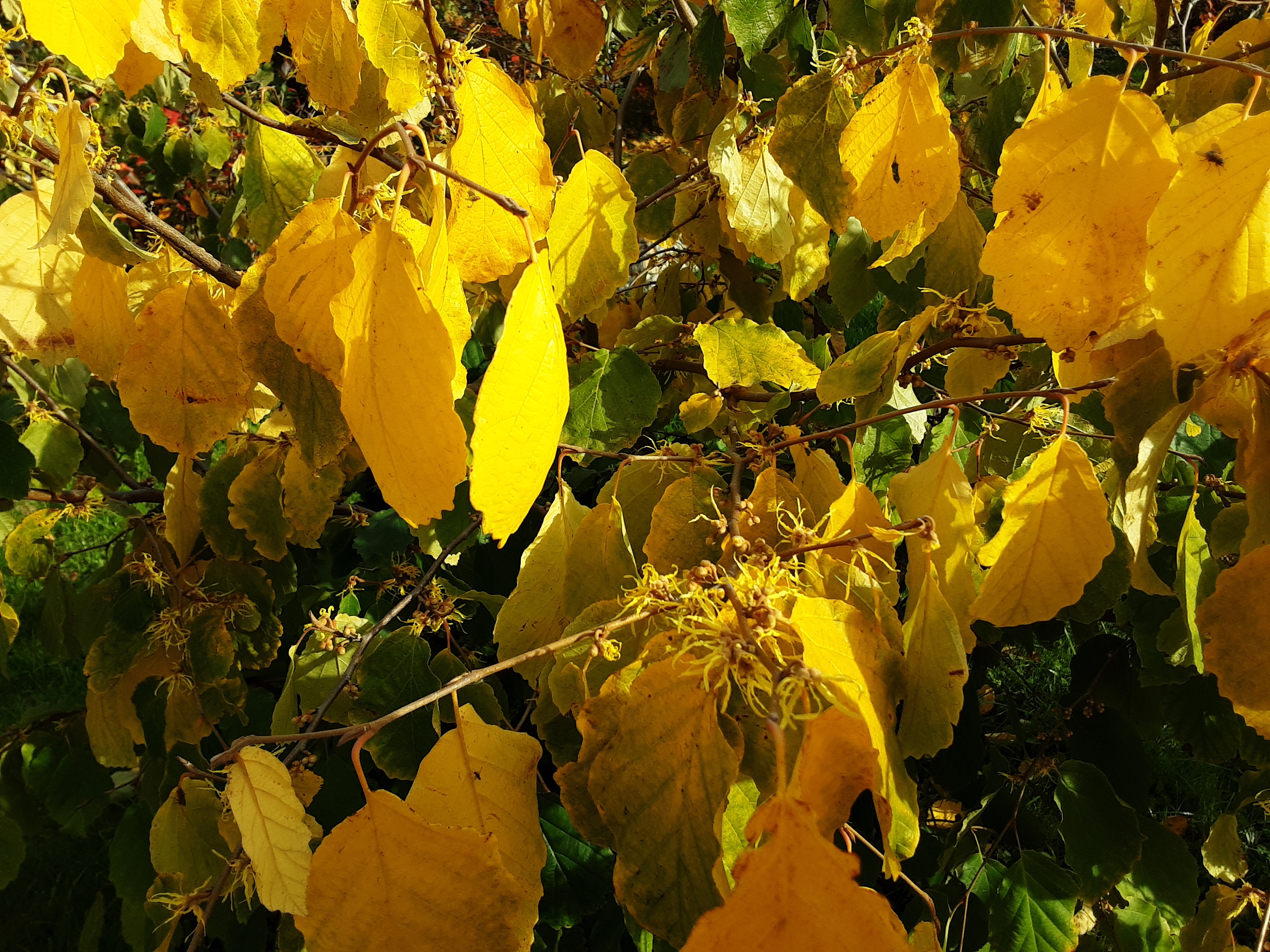 Виргинский гамамелис, вернее, оба куста: один - неделю назад, другой - на этой неделе, зацвели.