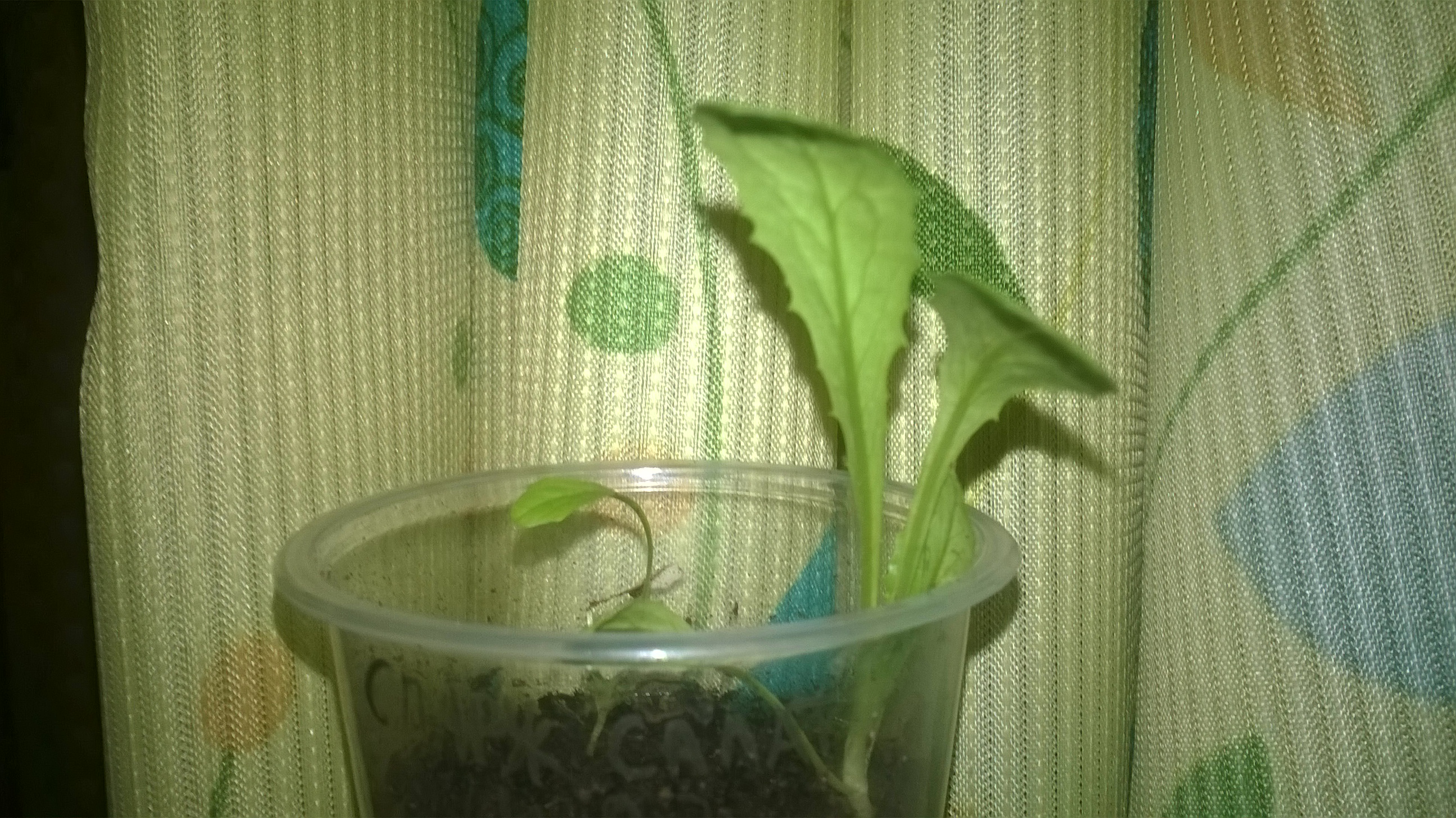 Я посеяла салат Айсберг-русский размер, только взошел. Теперь буду ждать настоящих листочков. На подоконнике места нет. Стоит в коридоре на этажерке с подсветкой, температура, наверное, высоковата для салата -24 градуса.