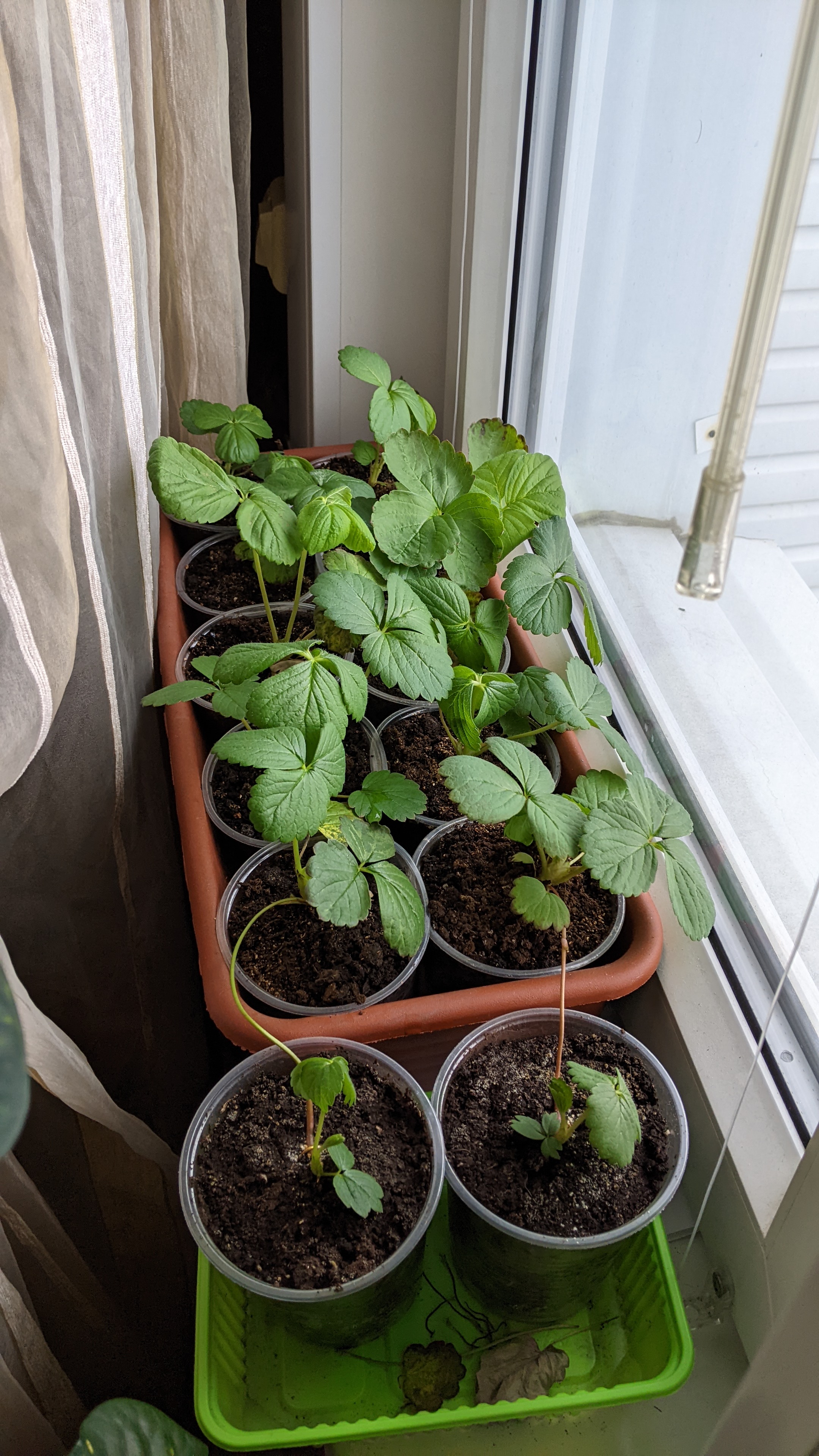 причём, причиной избытка температуры может быть сама подсветка. Только резко ничего не меняйте. Если я правильно помню, настоящие корни у земляники мочковатые и начинают они расти от семядольных листиков, а не от туда, откуда сейчас. Поэтому надо по чуть-чуть добавлять грунт, может быть даже песок и не упускать из вида постоянно, потому что они сначала заваляться на этих длинных ножках, под собственной тяжестью, как это бывает у взрослых кустов на концах усов, а потом из розетки пойдут корни. Сейчас их главное не запарить, проветривать каждый день и следить. Поливать строго через поддон, не чаще раза в пол месяца, месяц.