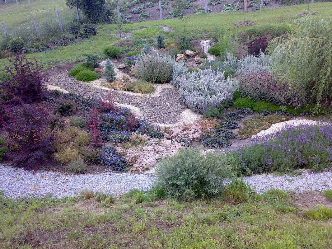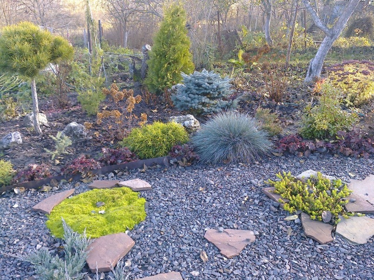 На данный момент передо мной стоит задача обустройства в цветник малого ухода крутого южного склона. Почва тяжёлая, каменистая. Уклон, если ориентироваться по циферблату — 10 часов. Из родной, дикой растительности здесь чабрец, примулы, вероники, лапчатки, герани, коровяки, тюльпан родопский и многое другое.