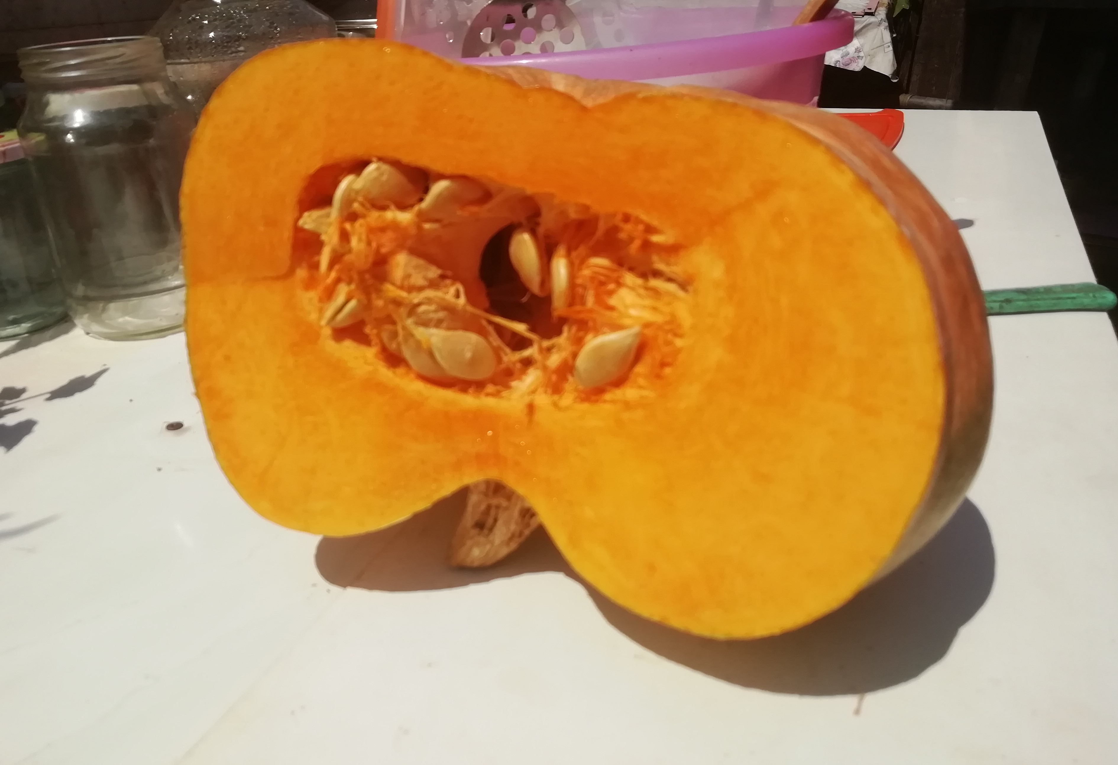 Из семян(на фото слева) выросли тыквины(второе фото). Одну разрезал, 5,5 кг, в ней такие семена(на фото справа), это все что было. Запах свеженький такой, спекли, пока пеклась, дочь сказала воняет, сунул в рот ложку - сказала нормальная, но потом есть не стала т.к. воняла. Жена тоже сказала: надо которую всегда у нас издавна садили. Мне вкус и запах понравился, тыквенный, просто немного другой, всё нормально, я её и съел, семья привыкла к другому. Не волокнистая, сочная, на противень не вытекла. Либо заморожу - в тушёных овощах потом и не заметят, либо печь буду половинку этой и привычную.