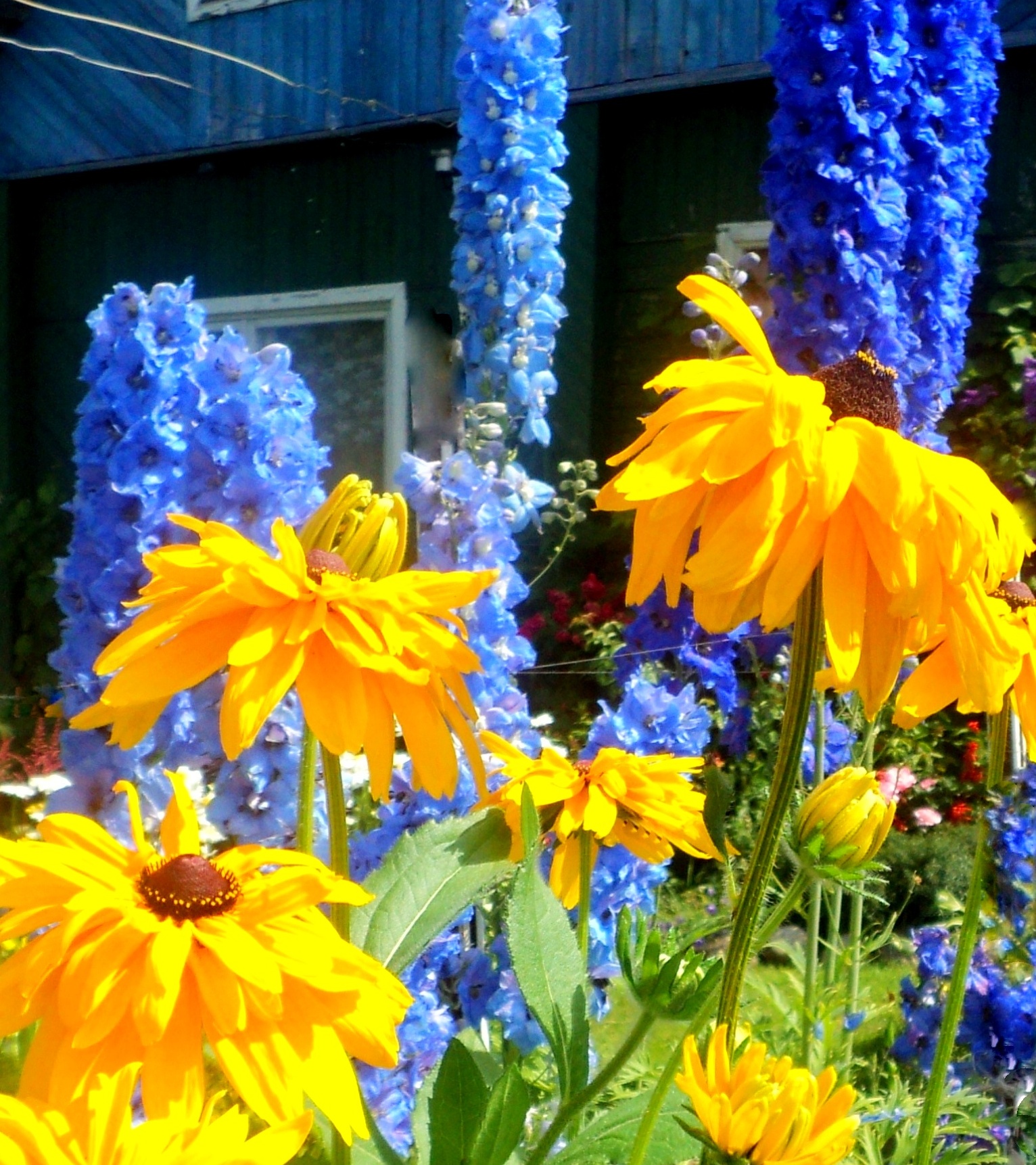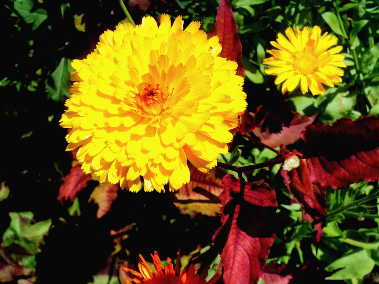 Или "похолоднее" сделать жёлтое сочетание - добавить голубовато-пурпурный цвет. Или вишнёвый - георгины. Или серовато-голубоватые листья бруннер. Или вазу голубую поставить!