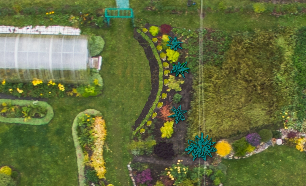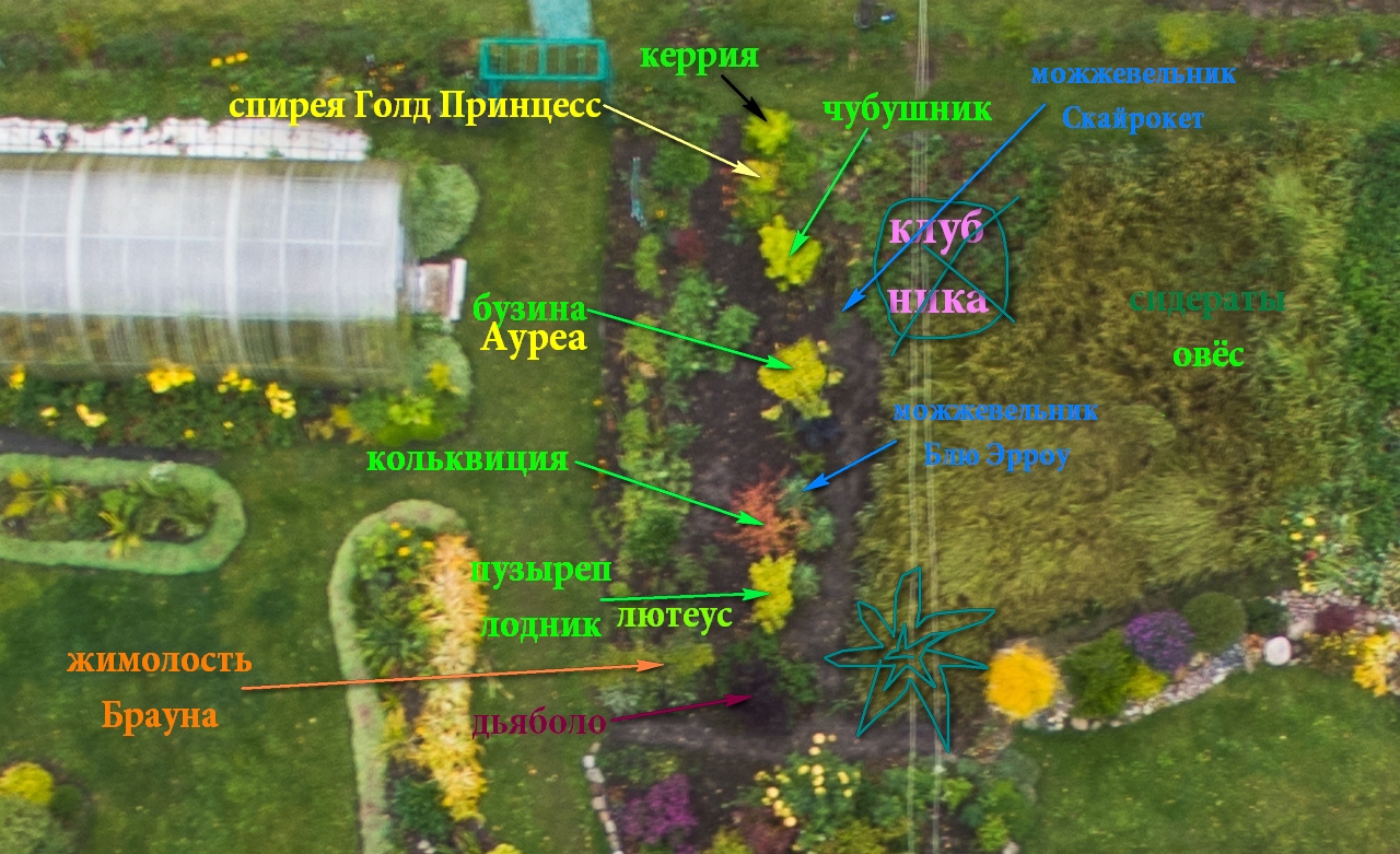 Раньше как-то не задумывалась, как смотрится участок в общем. Продумывались отдельные места. А теперь, когда сын снял дачу с высоты, поняла многие свои ошибки. Подумала, что и вправду нужно больше придавать значение цвету. Поняла, что много жёлтого у меня. Не могу сказать, что это расстраивает, вроде, нет, я его люблю. Вот любим же мы осенний лес с жёлтой листвой! Вопрос - надолго ли? Одно дело посадить много рудбекий и гелениумов, и совсем другое - деревьев и кустов... :-(