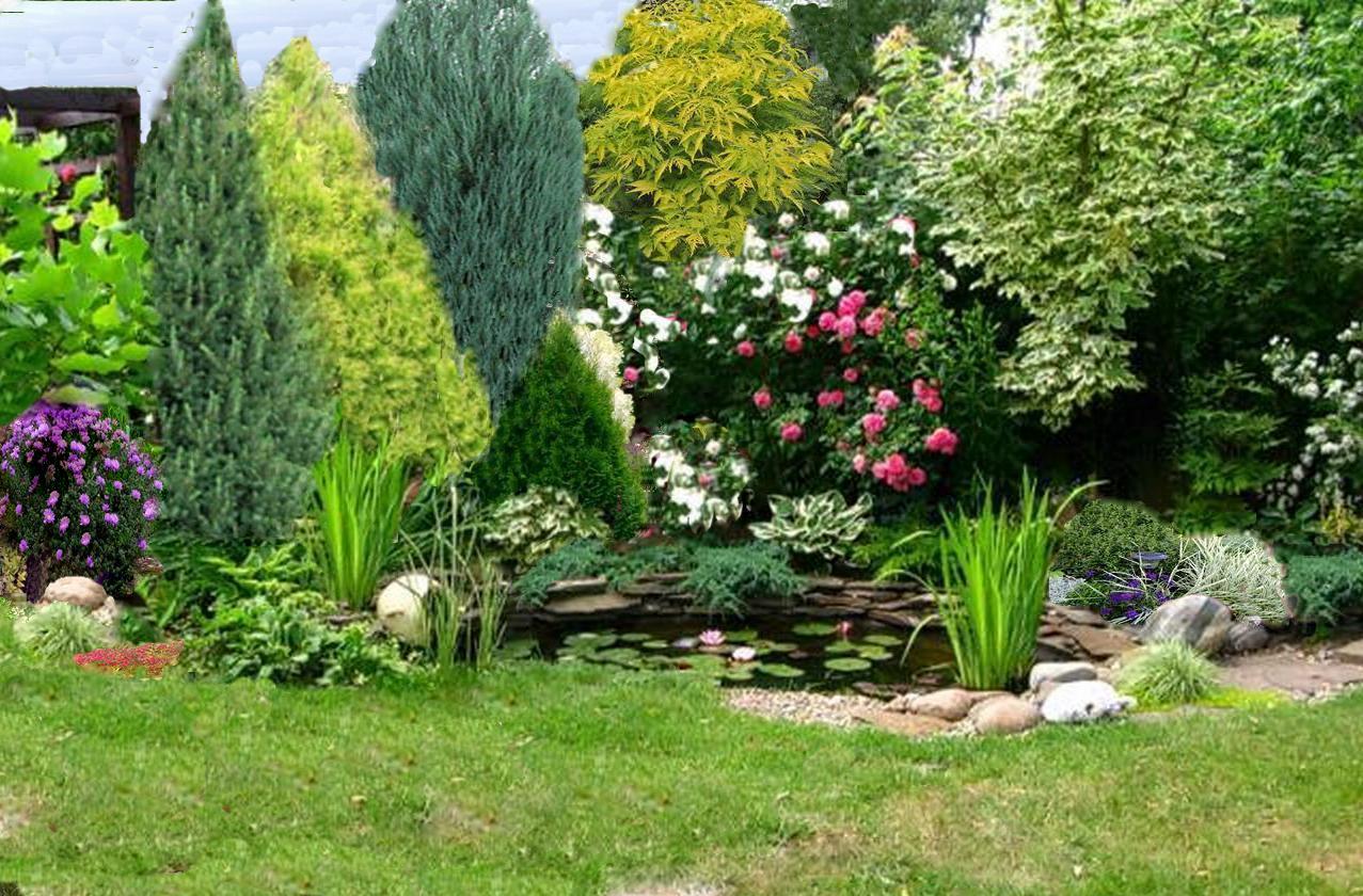 Вот эту красоту увидела и не смогла устоять. Это участок Юлии Тадеуш. От её прудика выпала в осадок и захотела себе такой - личный домик для нимфеи. На фото прудик такой уютный... И окружение супер! Вот и размечталась... Добавляла те растения, что были в наличии, представив их во взрослом виде.