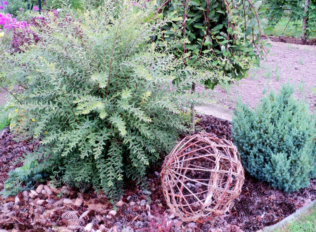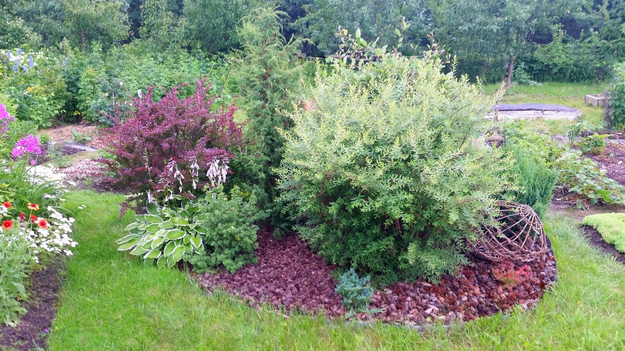 Ой, Ленусь, там всё гораздо хуже. Расскажу, посмейтесь! Я ж писала, высокая стенка, не просто шуточки. Вот будто кто заставляет меня. Планировала отделить тропинку от огорода разными кустами и хвойными. Там была клумба, за ней начала полукругом высаживать кусты, пару можжевельников (Скай Рокет и Блю Эрроу)... вроде ничего не предвещало ужаса... Но потом посадила бузину Ауреа (а она растёт высокой и широкой)