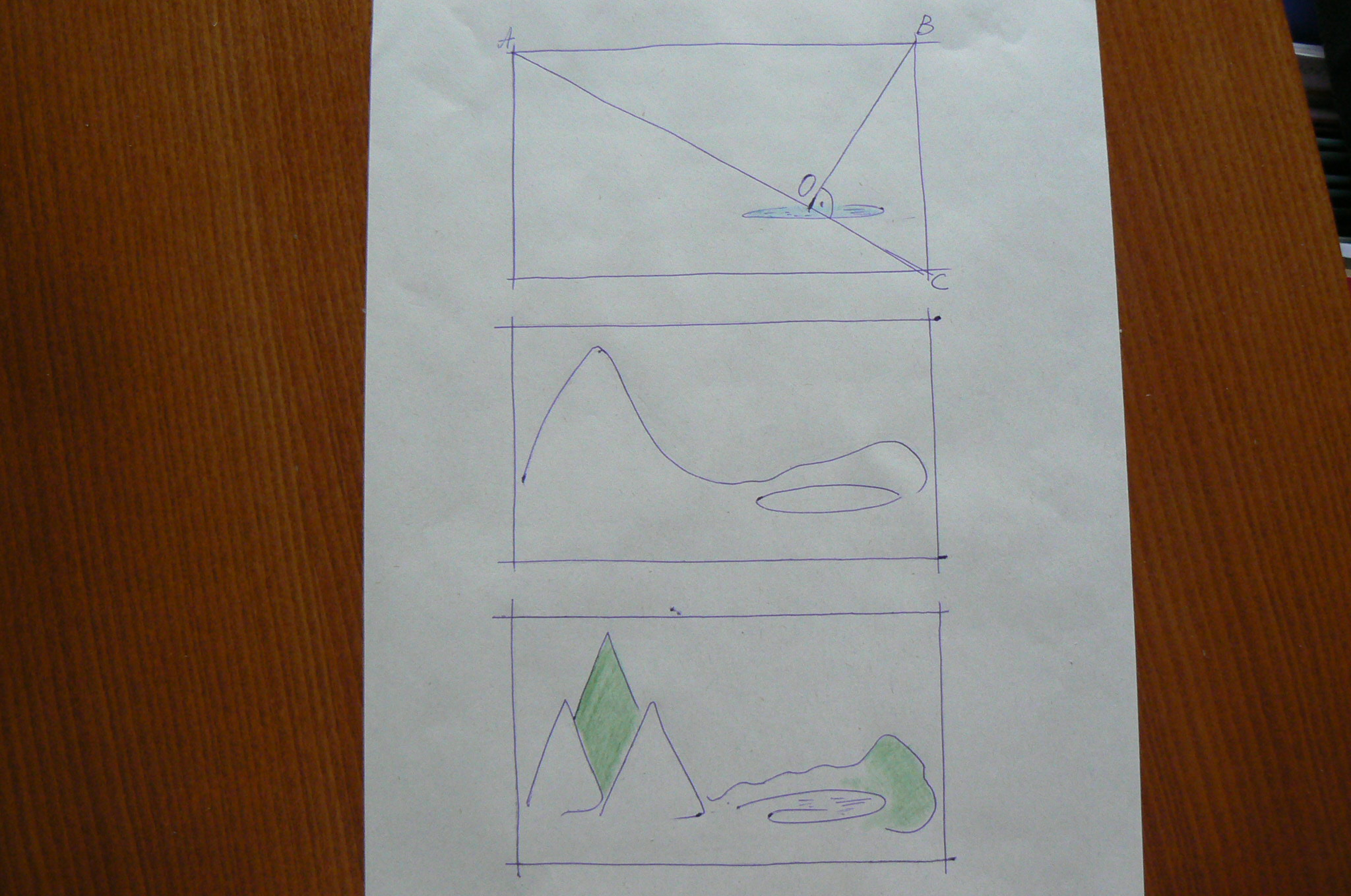Вот, кстати... Композ. центр ищется по правилу Золотого сечения. Картину(вид, что открывается дачнику со смотровой точки) представляем прямоугольником из двух треугольников. Из вершины В на основание треугольника АВС опускаем высоту. Получаем точку О - фокусную точку или композиционный центр. Татьяна, как раз, своим прудом в фокусную точку попала.