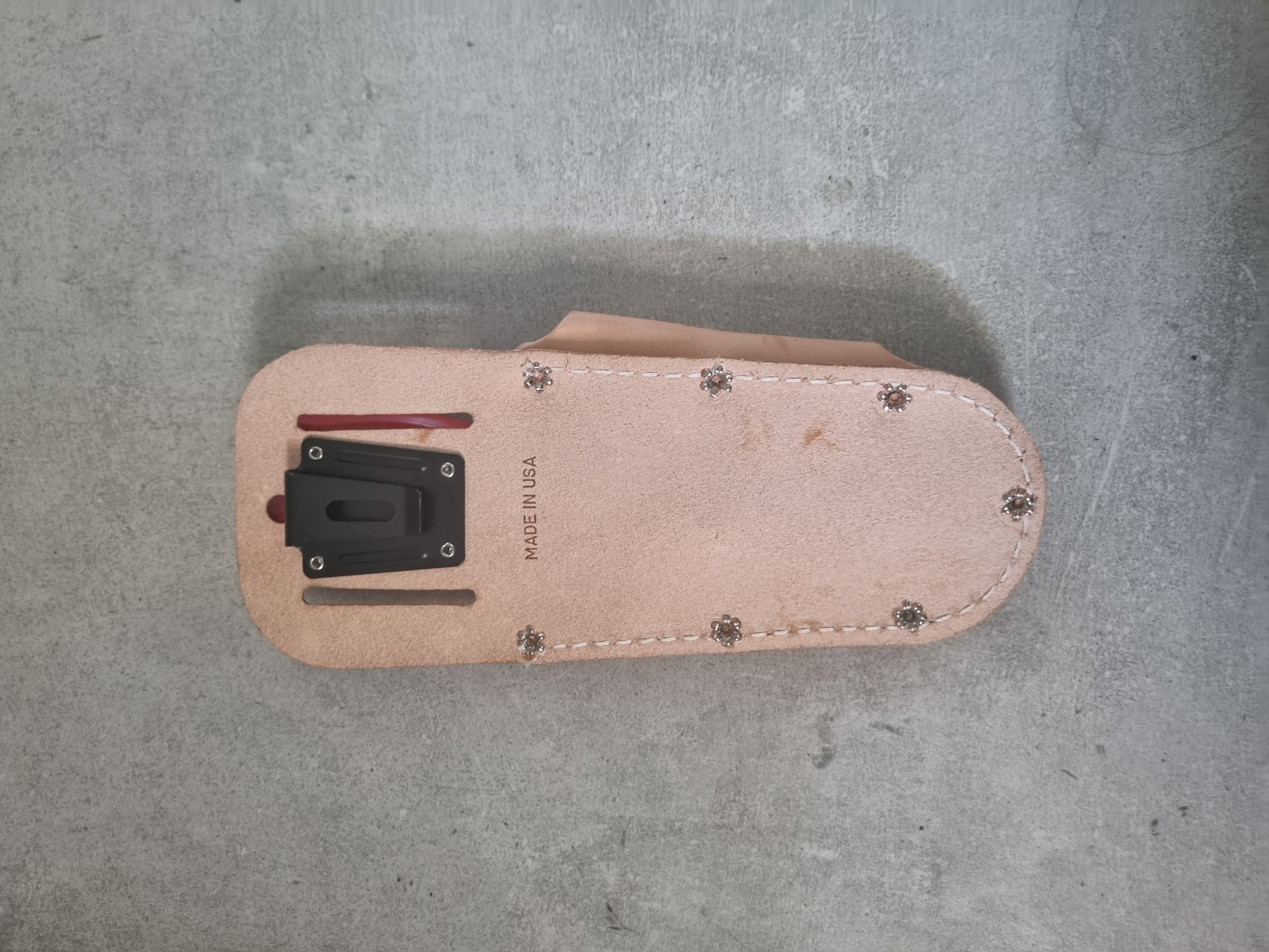 Надоело в кармане таскать секатор (карман рвётся, секатор выпадает). Заказал "кобуру" на амазоне. Выполнен из жёсткой кожи, сзади клипса на ремень. Второй, маленький отсек в принципе для точильного бруска, но можно и нож хранить. Цена вопроса около 25 евро.