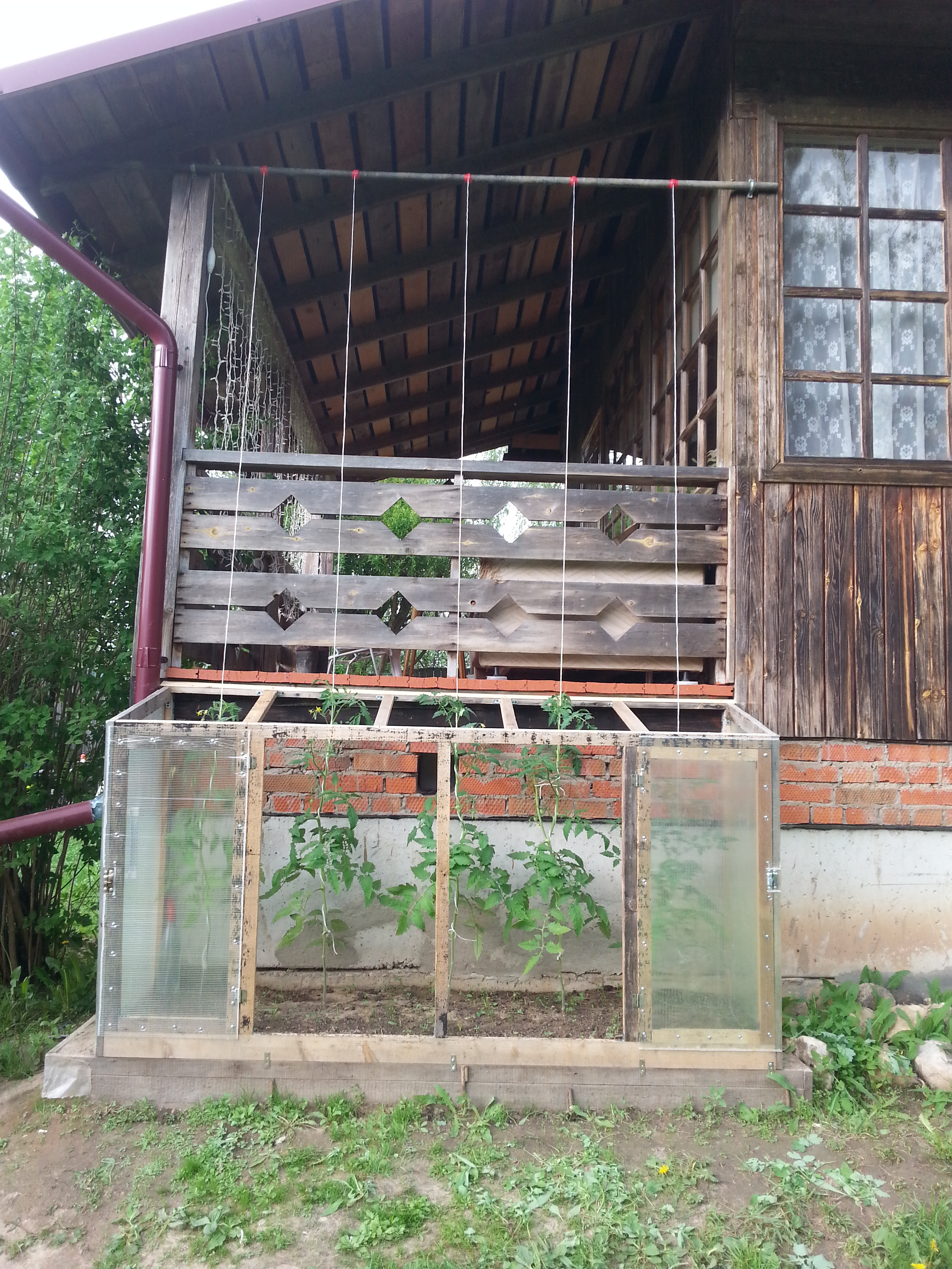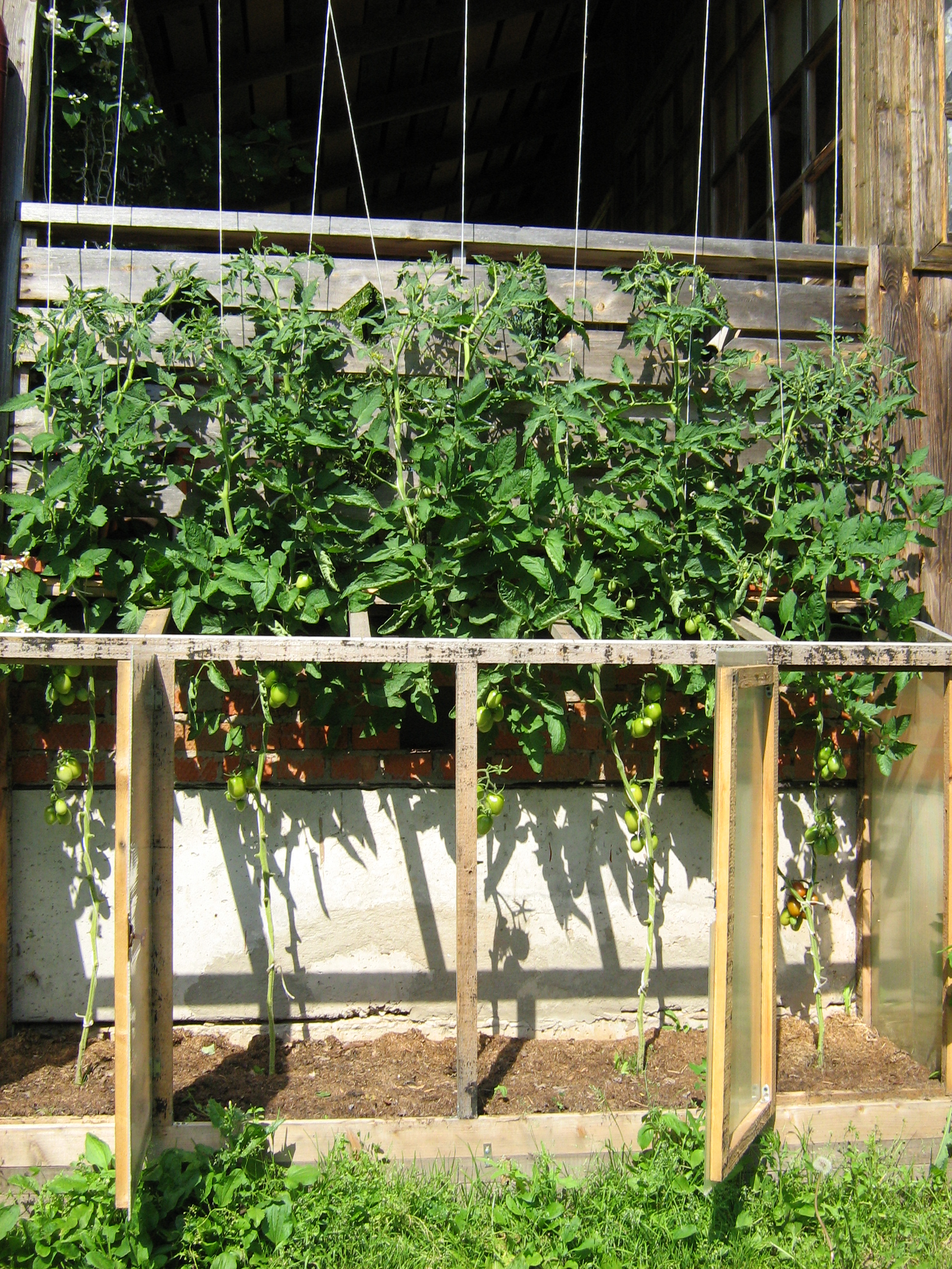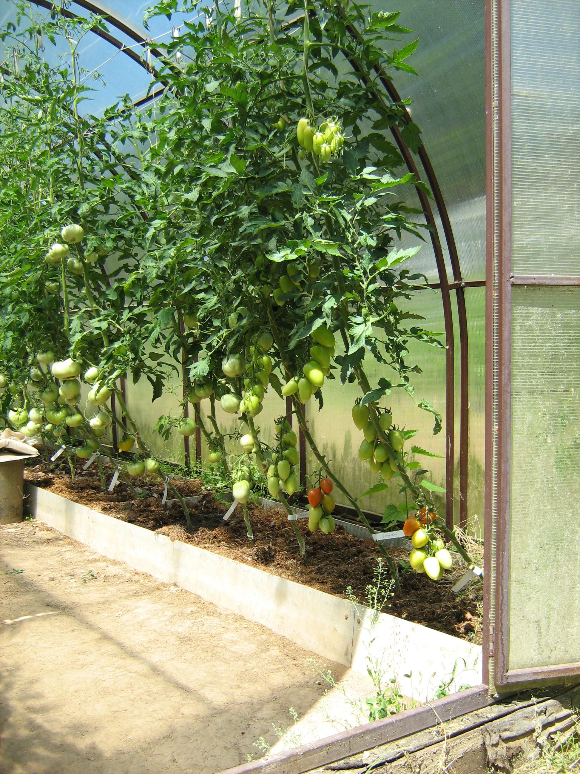 В мае высадил Де-Барао в пристенную (прифундаментную) тепличку, после того как кусты подросли и уперлись в крышу я её снял, а кусты подвязал к перекладине. Первый помидор покраснел в конце июня, ну срывали по мере созревания и остальные.
