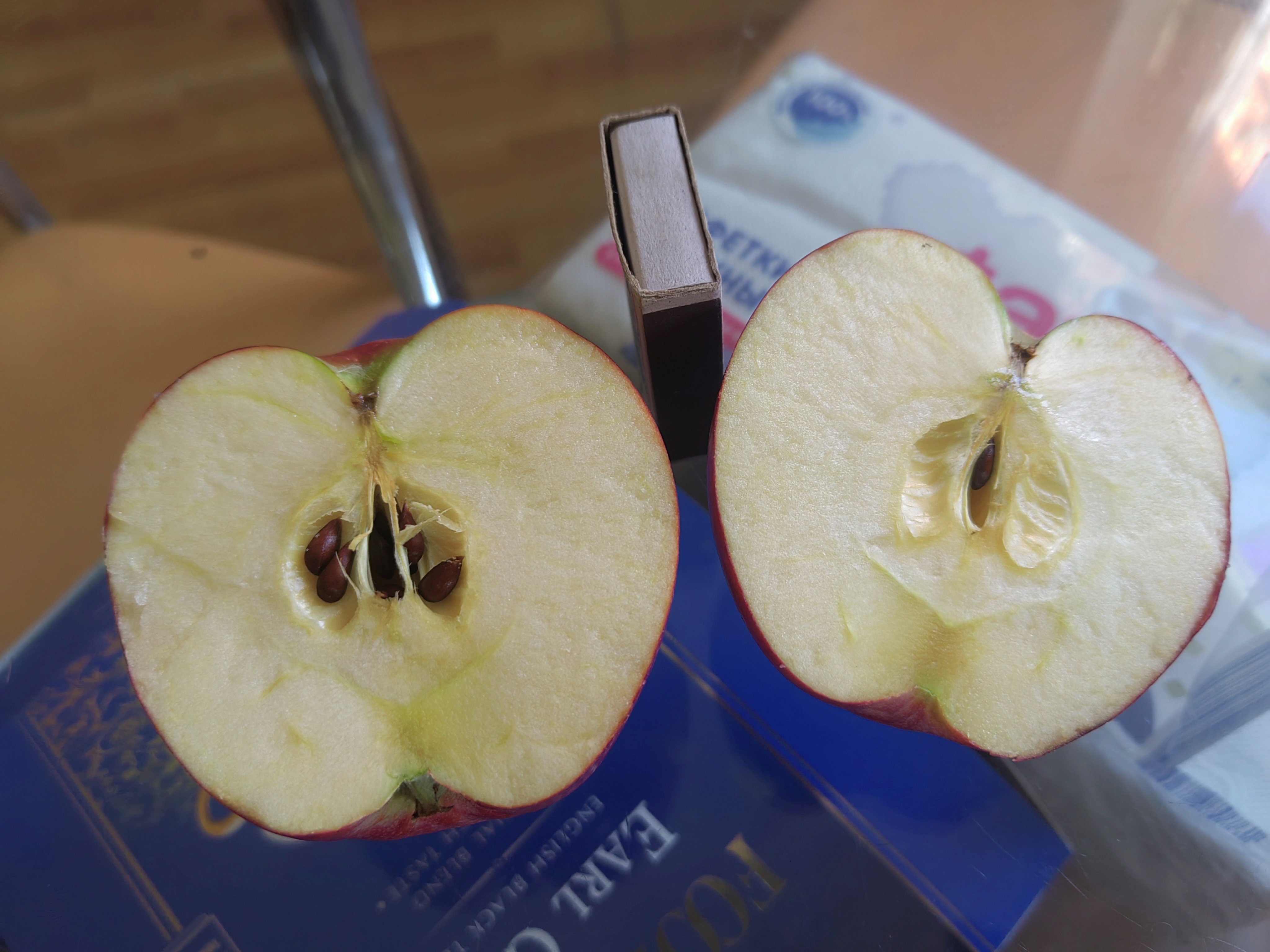 Всем привет! В Магните продаются вот такие сезонные яблоки отечественного производства. Вес до 200гр, по форме большой разброс, я выбрал больше уплощенной формы. Заметные зеленые подкожные точки. Вкус немного напоминает Р.Семиренко, мякоть крупнозернистая, кремового оттенка. Что может быть?