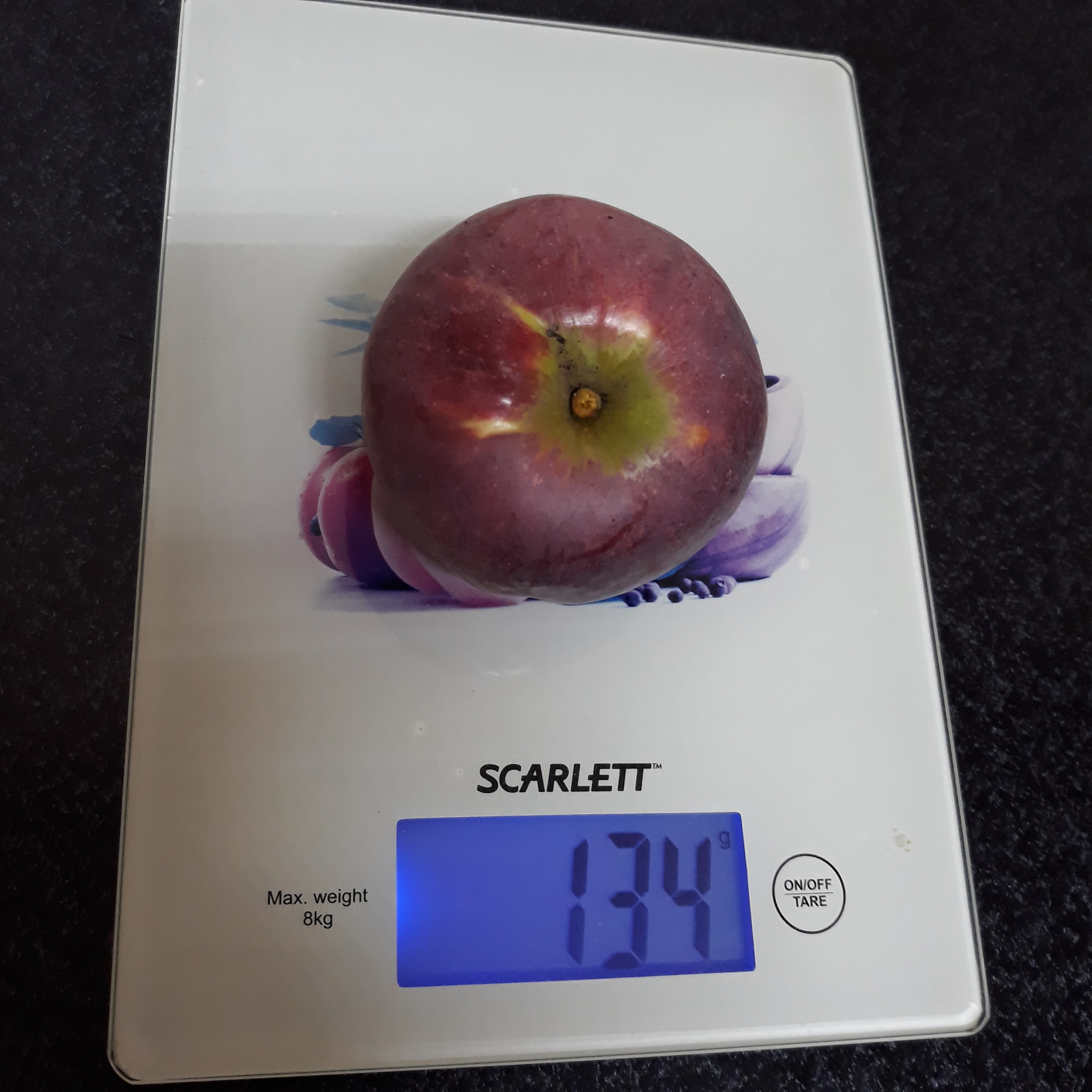 У соседки по даче растёт вот такая яблоня. В нашей зоне в середине августа плоды спелые, раньше сорта Елена, с окрашенными семечками. По весу грамм 140-150. Фото в разрезе нет. Кажется периодичного плодоношения, плоды местами чуть подгнивают на ветке, не более 1-2%. По вкусу близка к Мелбе, может чуть менее насыщенный вкус.