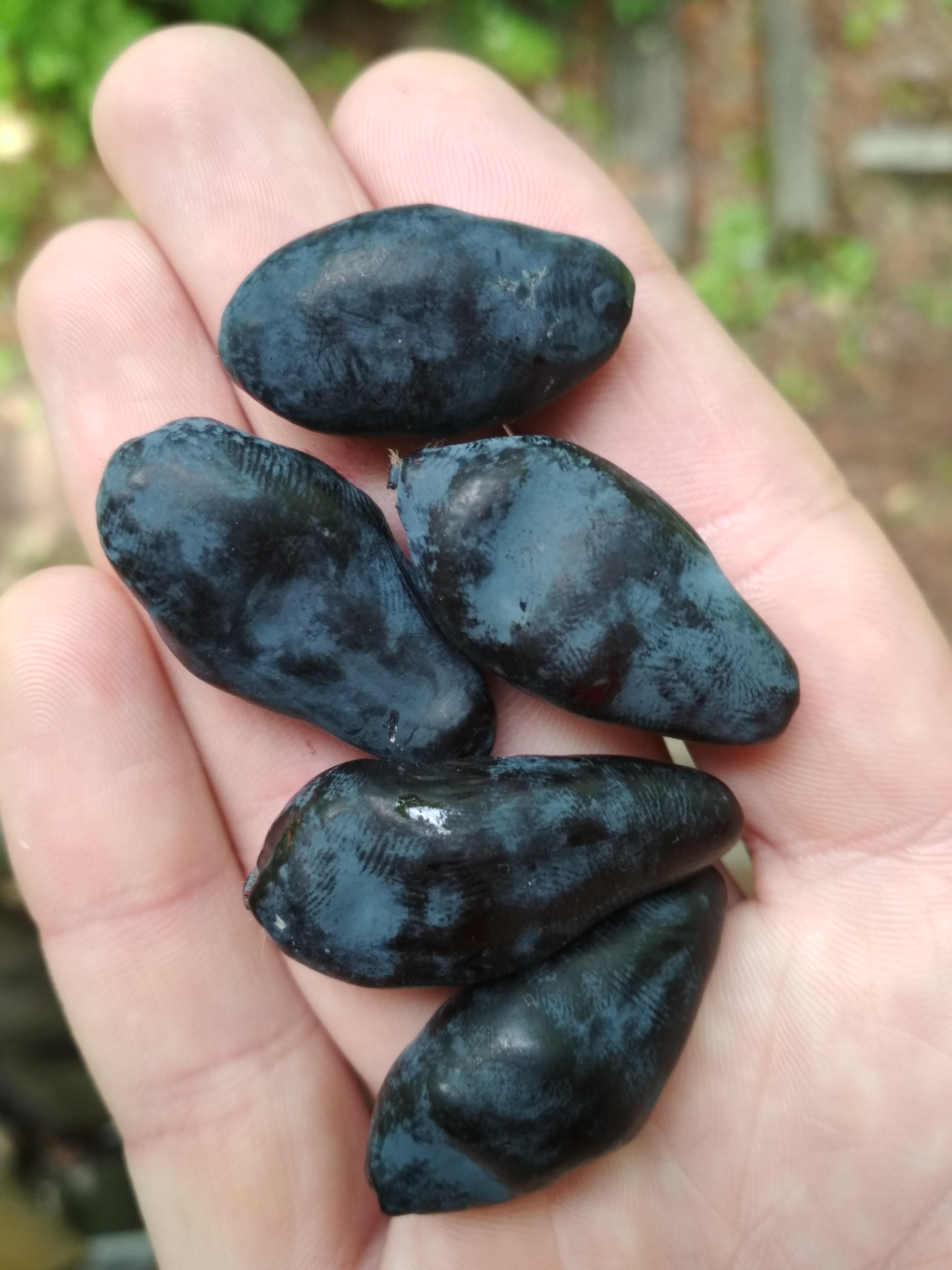 Мой друг геолог,влюбленный в жимолость,лет 5 назад подарил коробочку с крупными семенами от жимолости с базара г Магадана.Семян было много и таких крупных я раньше не видел ..Я посадил и через 3 года отобрал 5 саженцев .Поразили разнообразием формы плодов и размером ягод ,вкусом и надеюсь и