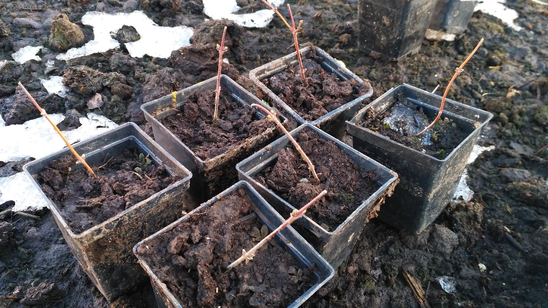 Был сегодня в деревне. Первым делом проверил как мои прикопанные горшки с укорененными черенками прошлого года Картина знакомая - грунт промерз, под горшками ледяной панцирь и воде некуда уходить из горшков. Срочно взялся за лопату, выдолбил горшки из грунта Что самое интересное - на всех черенках набухли почки в стадии зеленого конуса. Таким образом можно прошлогодний эксперимент считать удачным. Заблаговременно прикупил горшки на 3 л., буду доращивать черенки еще годик в горшках, а по осени хочу посмотреть что из этого получится.