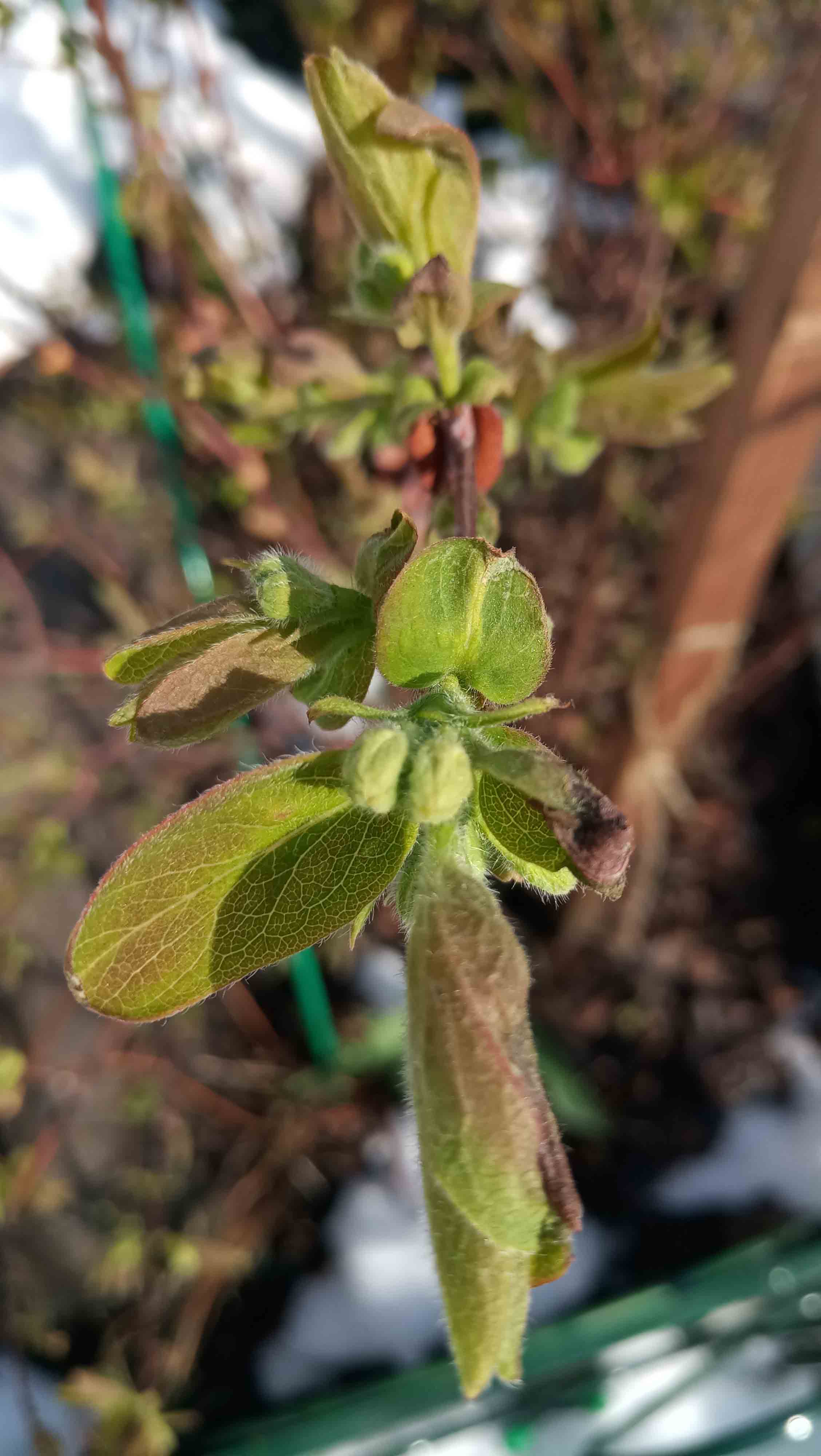 Фоточки от 14 апреля. Вот такая жимолость, с листиками и бутонами вышла из под снега. Извиняюсь, фотки крупные получились, не хотят уменьшаться.