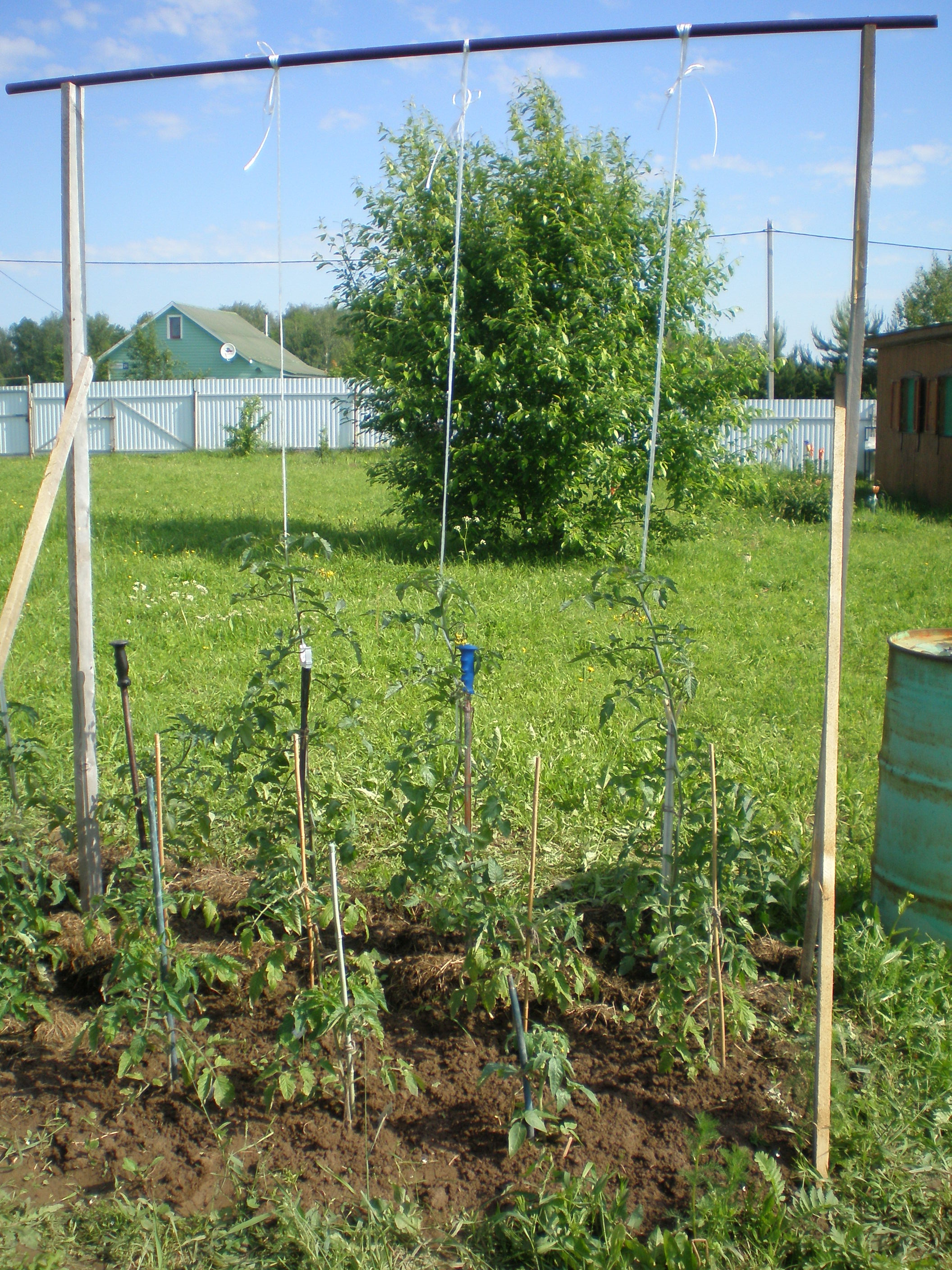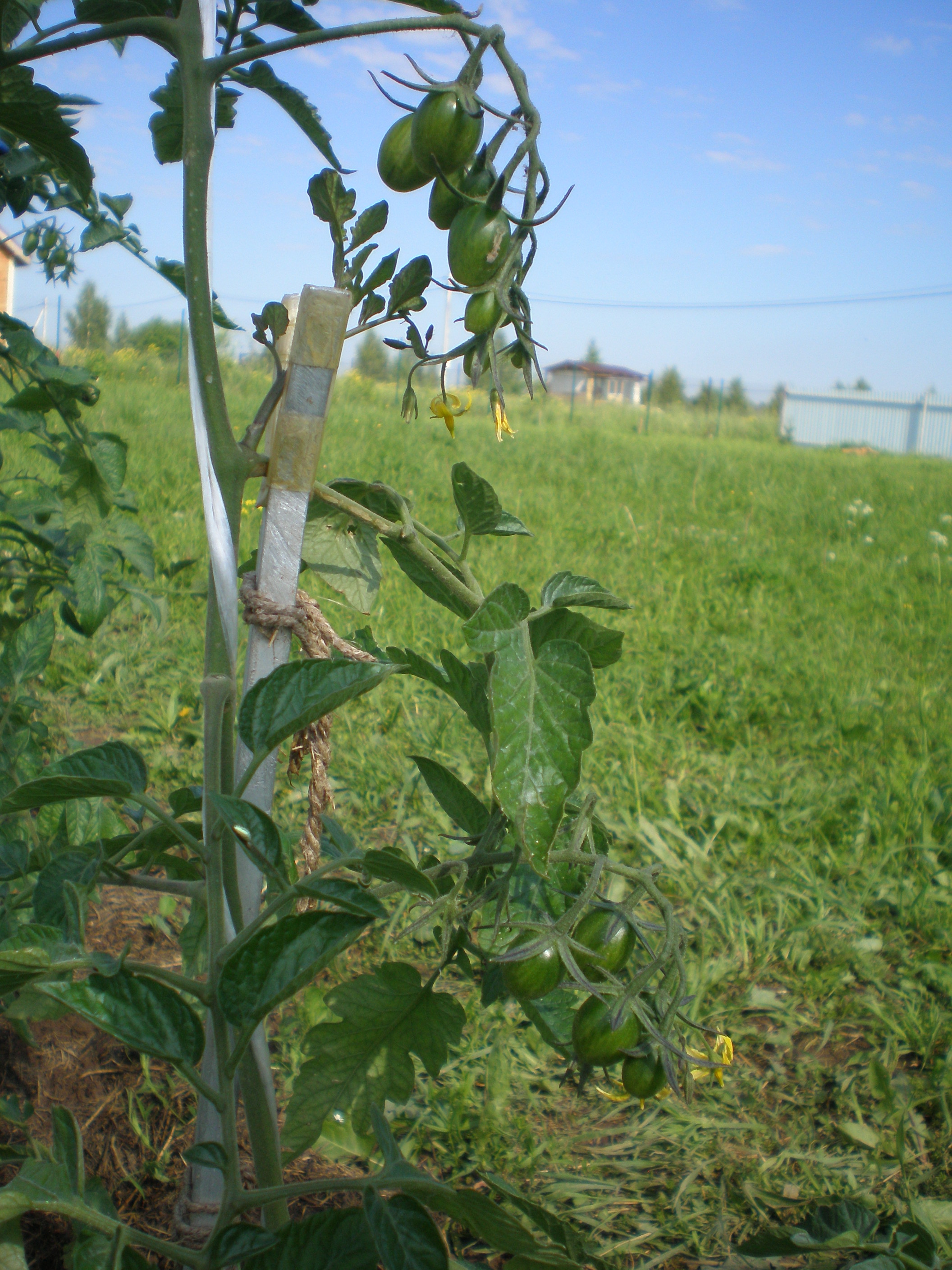 Так я Черрики высокорослые определила вообще в ОГ,дальним рядом на маленькой плантациии построили для них-перекладину высокую,типа турника.Туда и подвязали Черри Иру. Уже по две кисти завязали,ранние они.