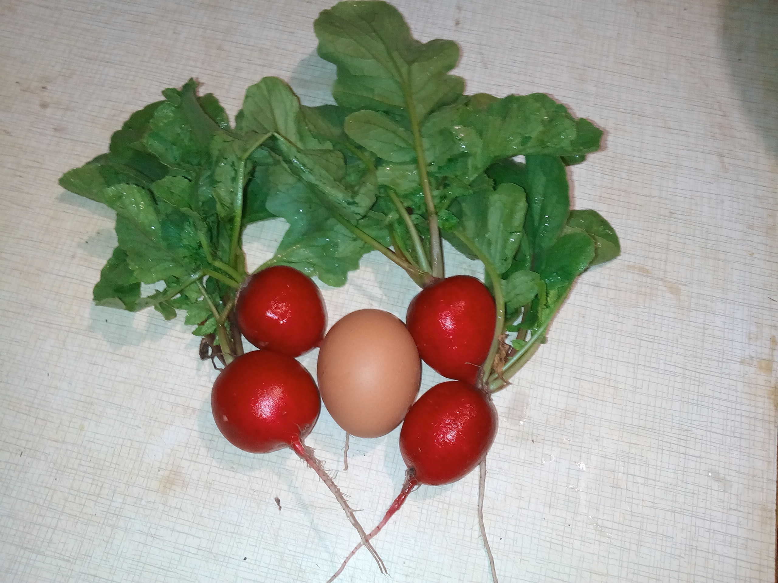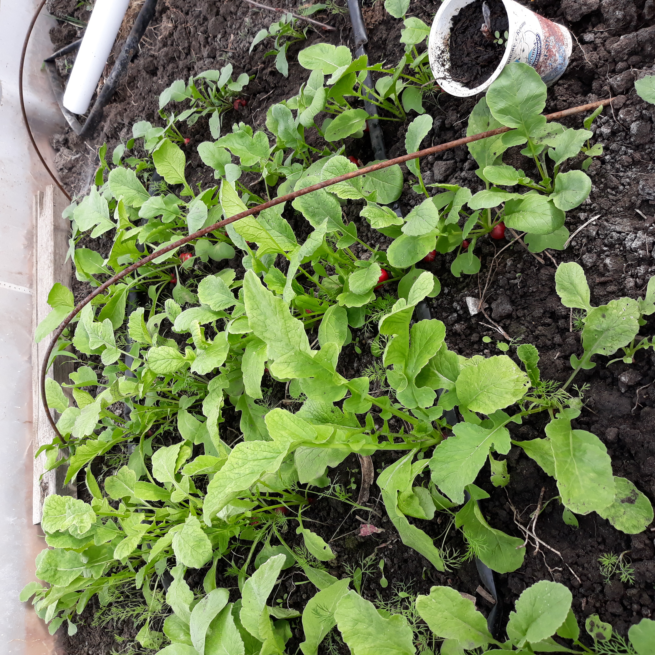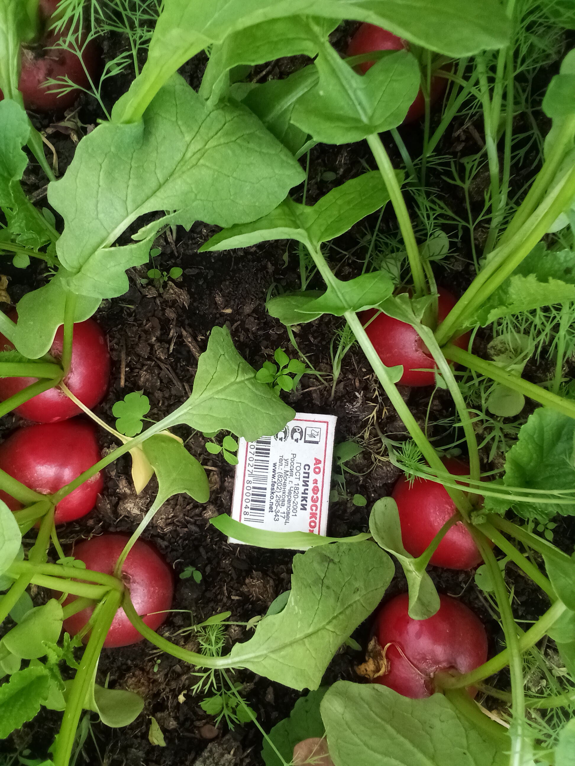 Сегодня вырвала последний редис из теплицы, острый стал, немного не завязался, в стрелу пошел, в ОГ проредила, взяла мелкий 1,5 см., конфетки с мелкими листьями
