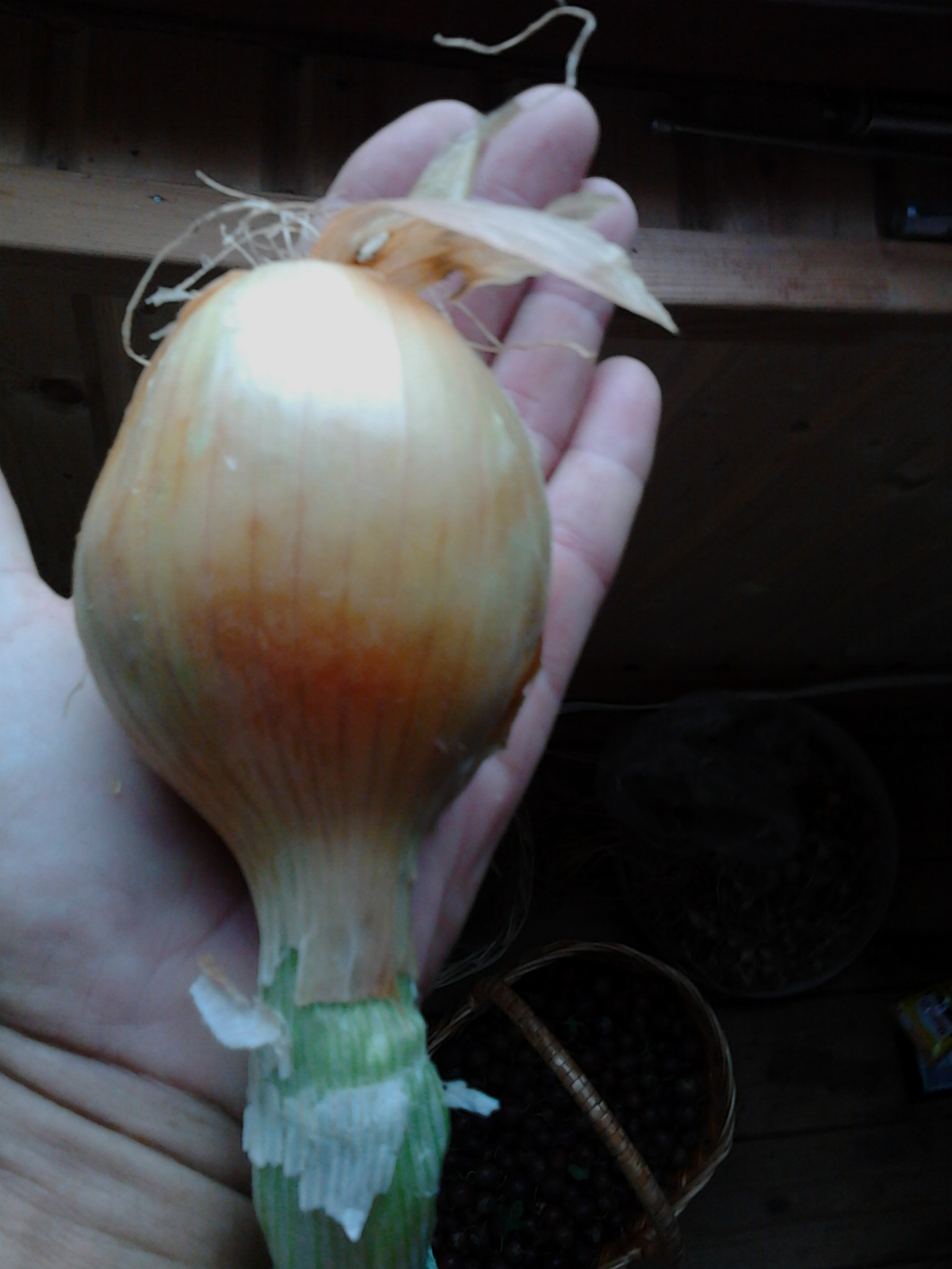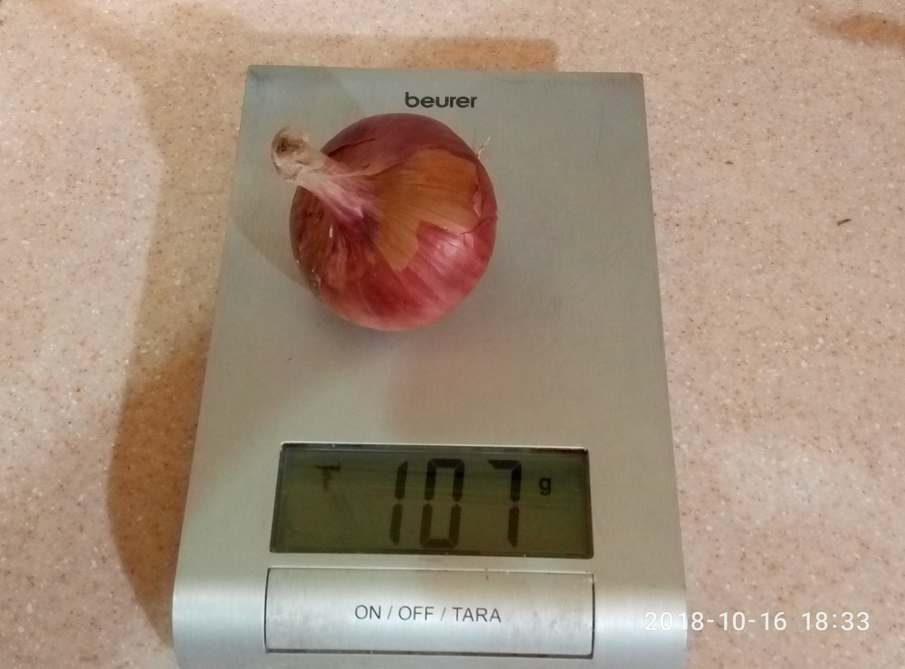 Рука нормальная, лук весом порядка 120-150 гр, не могу найти фотку, в семейке по две три штуки было, НО что не понравилось так это то, что под общей шкуркой находилась не одна , а две или три луковицы, и каждая одета в свою одежку, ну и соответственно , со временем эта "одежка" начинает гнить. Может это потому,что плохо просушивала , может это его такая особенность- не знаю, но я от него отказалась, хотя мой "размерчик".Вот в тележке он сверху лежит, где пачка от сигарет.