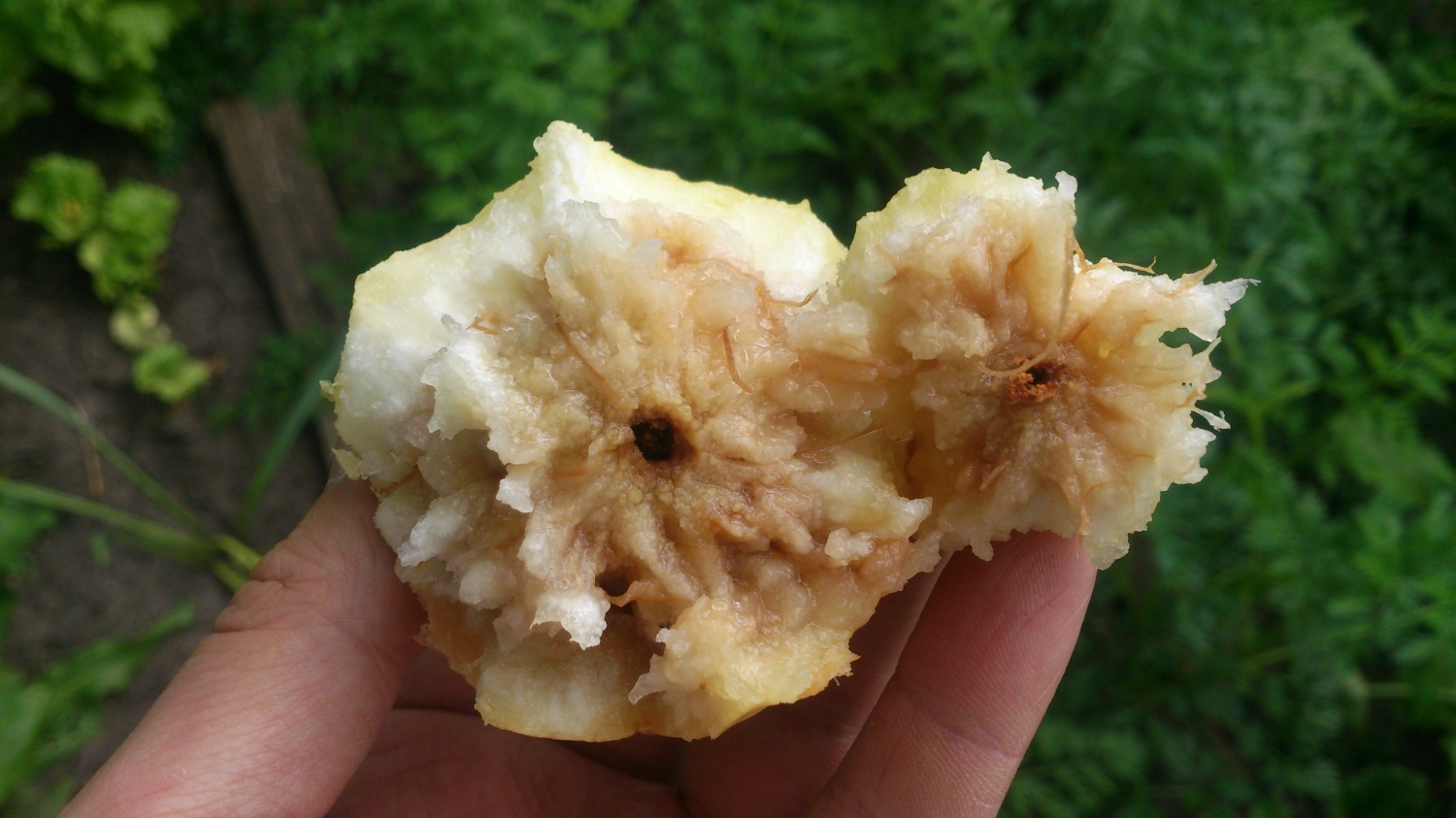 Ко всему прочему саженец привит на что то непонятное, в возрасте двулети заплодоносил, высотой по колено и с плодами. В месте прививки очень сильный наплыв, привой сильно опережает подвой. Саженец по всему не жилец. Написал им письмо с претензиями, проигнорировали. Второе письмо написал с просьбой чтобы хоть сорт назвали, тоже нет ответа.