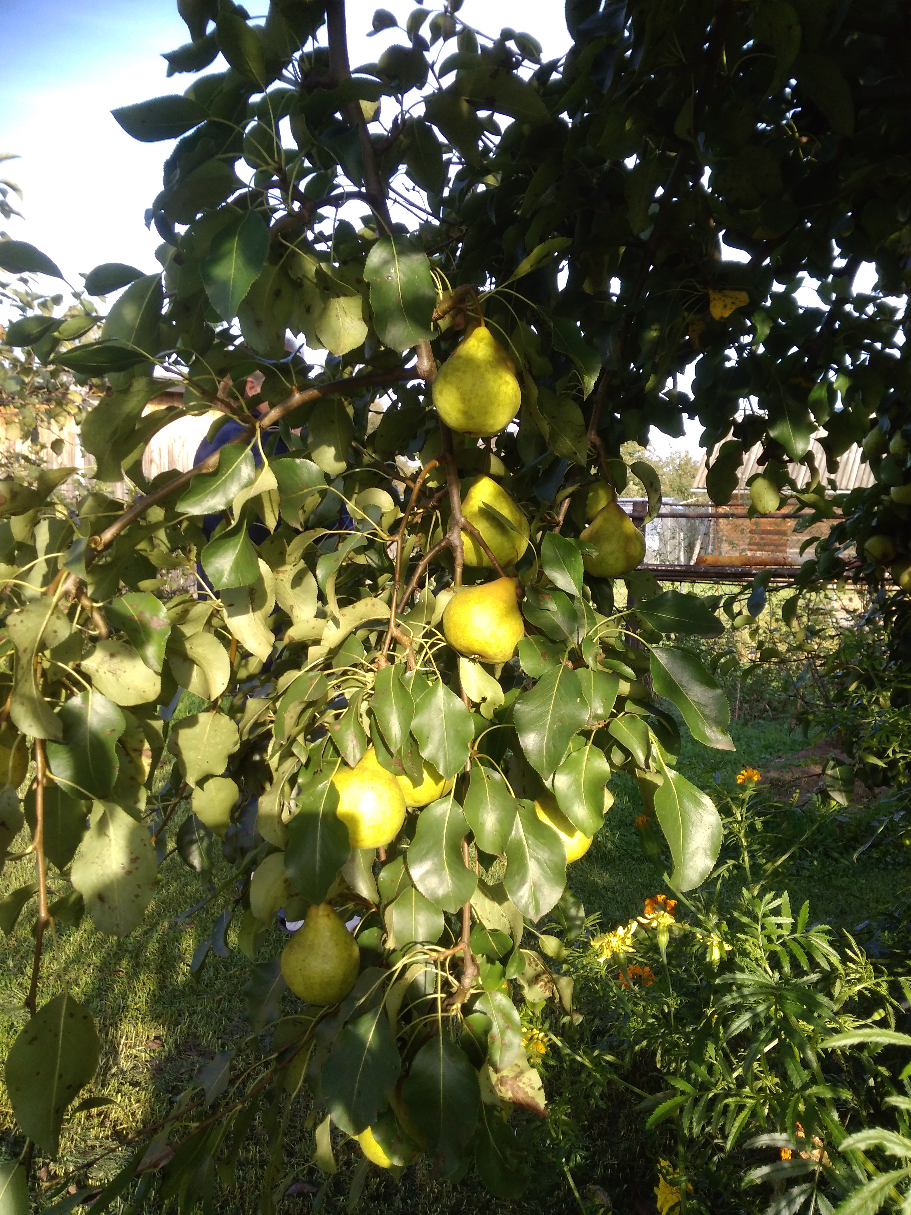 Вот фото груши у случайных знакомых.Все очень похоже на Памяти Яковлева,но совсем отсутствует терпкость,даже в этом году.У меня на П.Я.было часть плодов мелкими и не набрали вкуса.На 25 сентября с солнечной стороны груши скушали.Остались только в тени.